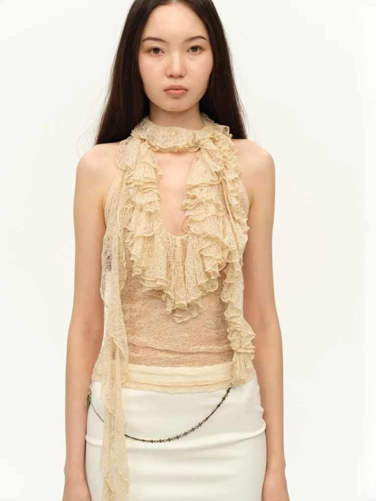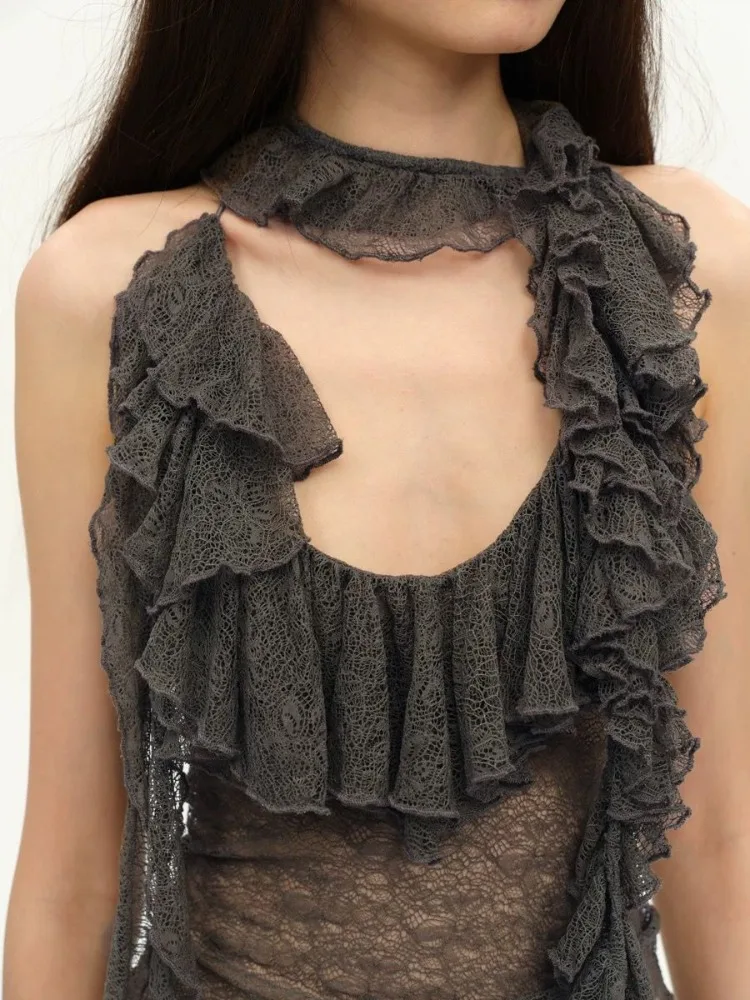 Lunivop Heavy Lace Ruffles Patchwork Halter Vest for Women See Through Mesh Gray Tank Top 2025 Summer New Slim Fit Tops Mujer