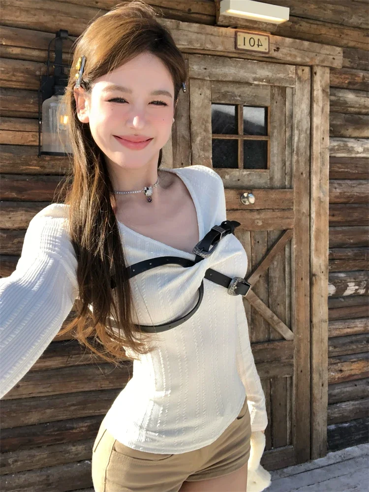 Lunivop High Street Fashion Pleated Belt Casual Long Sleeve T-shirt Women Spring New V-neck Solid Color All Match Slim Knit Tops