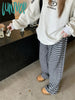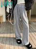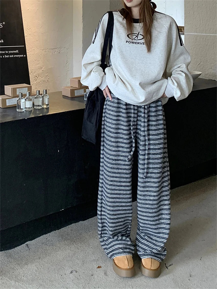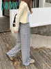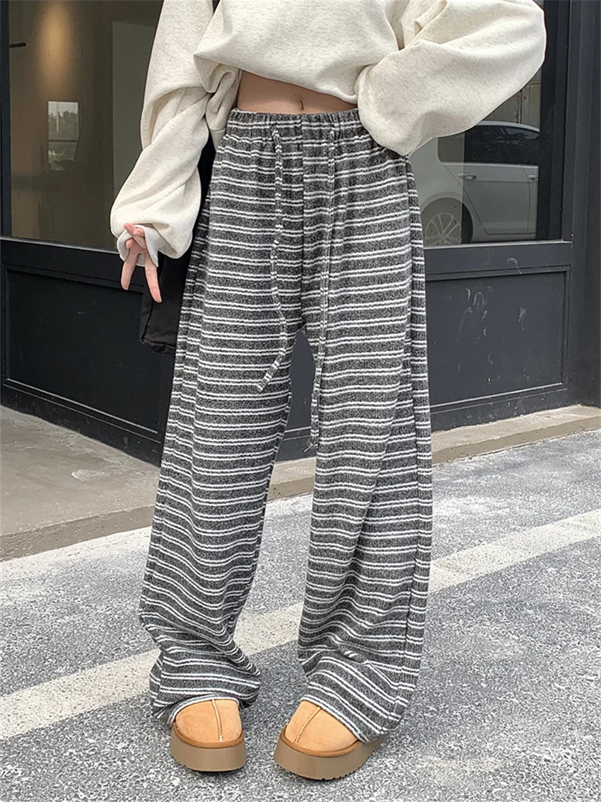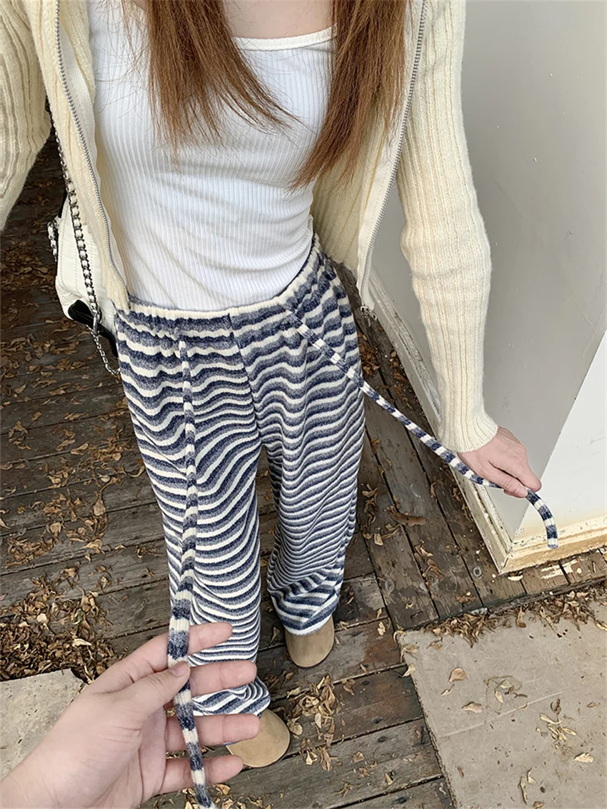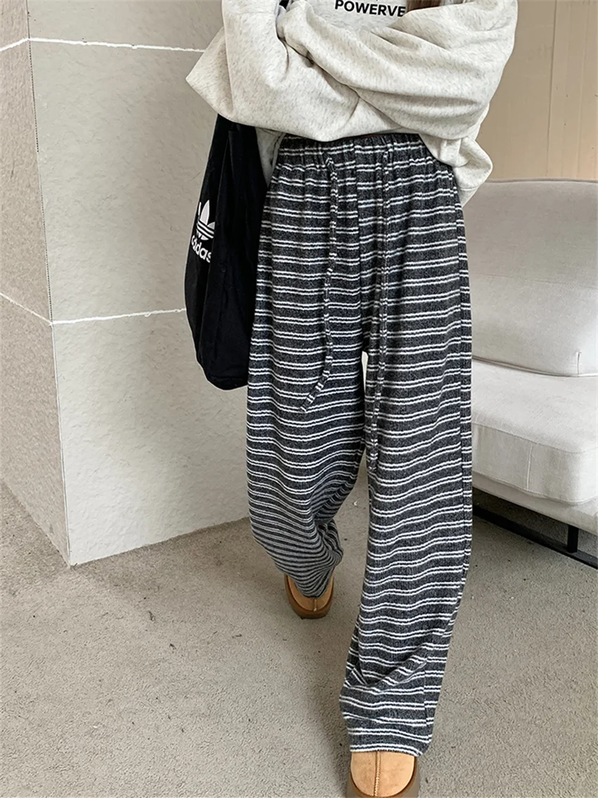 Lunivop High Street Trousers Women All Match Winter Knitted Warm Straight Office Lady Chic Loose Wide Leg Stripes