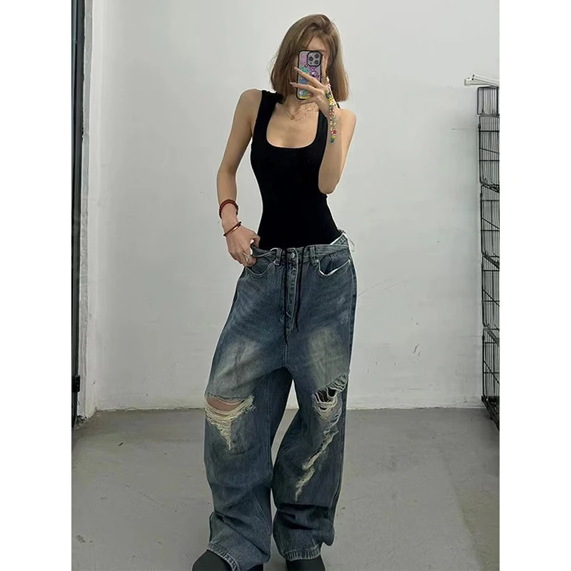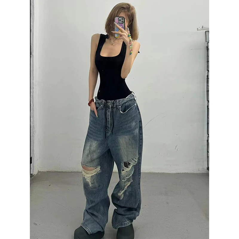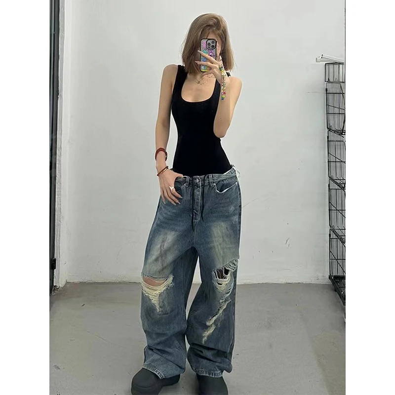 Lunivop High Waist Ripped Women's Blue Jeans Hip-hop Style Fashion Vintage Streetwear Y2K Wide Leg Jean 2000s Trouser Baggy Denim Pants