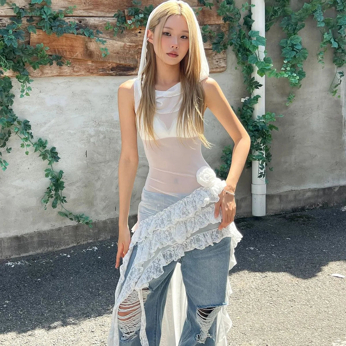 Lunivop Hooded Sheer Sleeveless Mesh Lace Ruffles Asymmetrical Short Women'S Dresses Fashion Y2K Streetwear Sexy Korean Clotehs