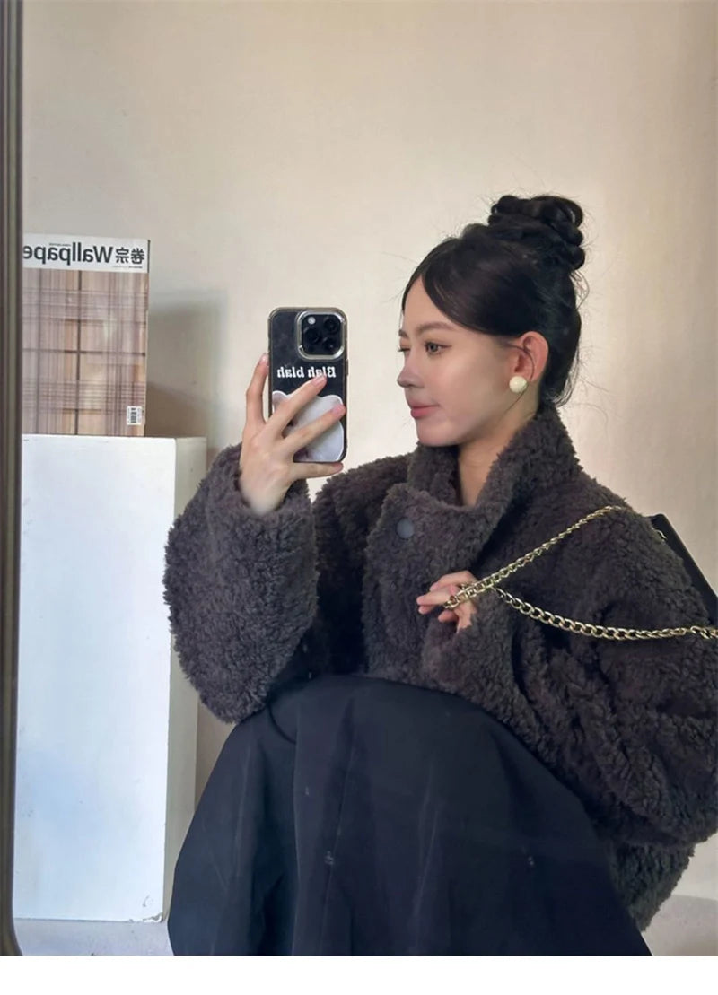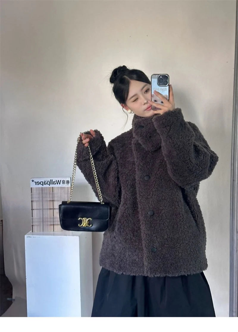 Lunivop Japan Cute Faux Lamb Coat Women Loose Long Sleeve Winter Warm Retro Jacket Casual Stand Collar Preppy Style Pockets New Top