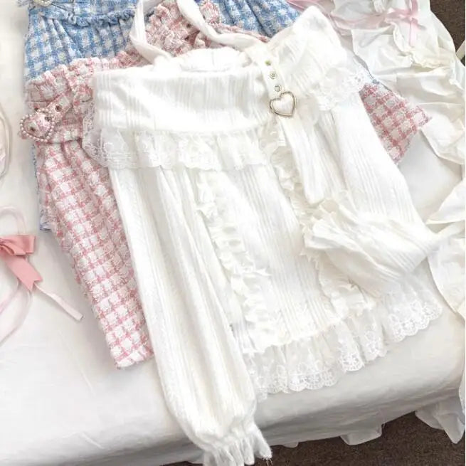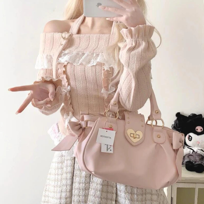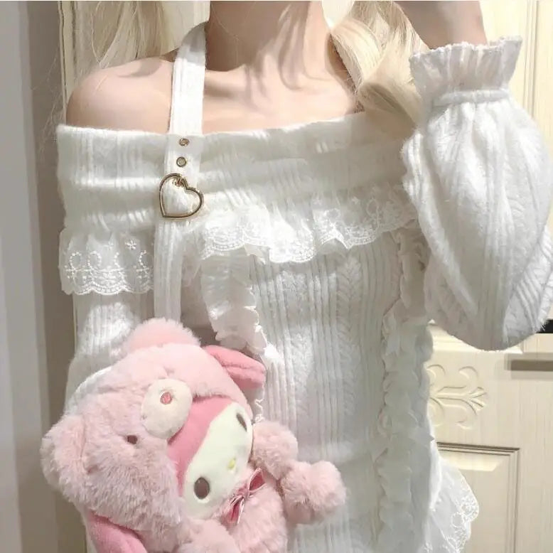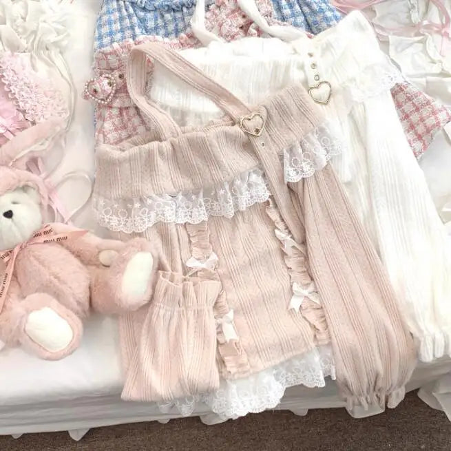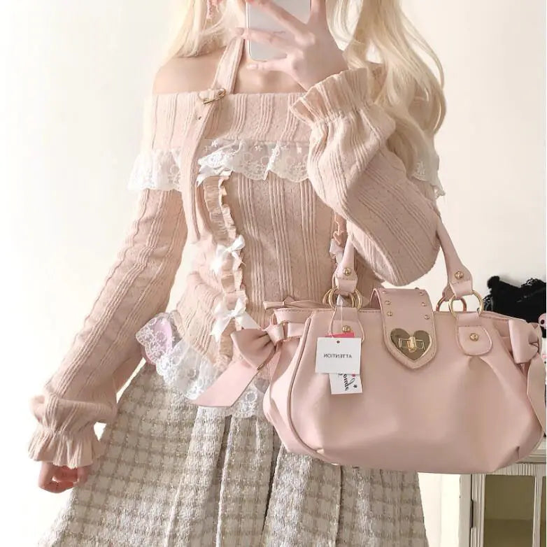 Lunivop Kawaii Sweet Knitted Pullover Women Off Shoulder Japanese Style Sweater Harajuku Lace Bow Cutecore Long Sleeve Sweaters