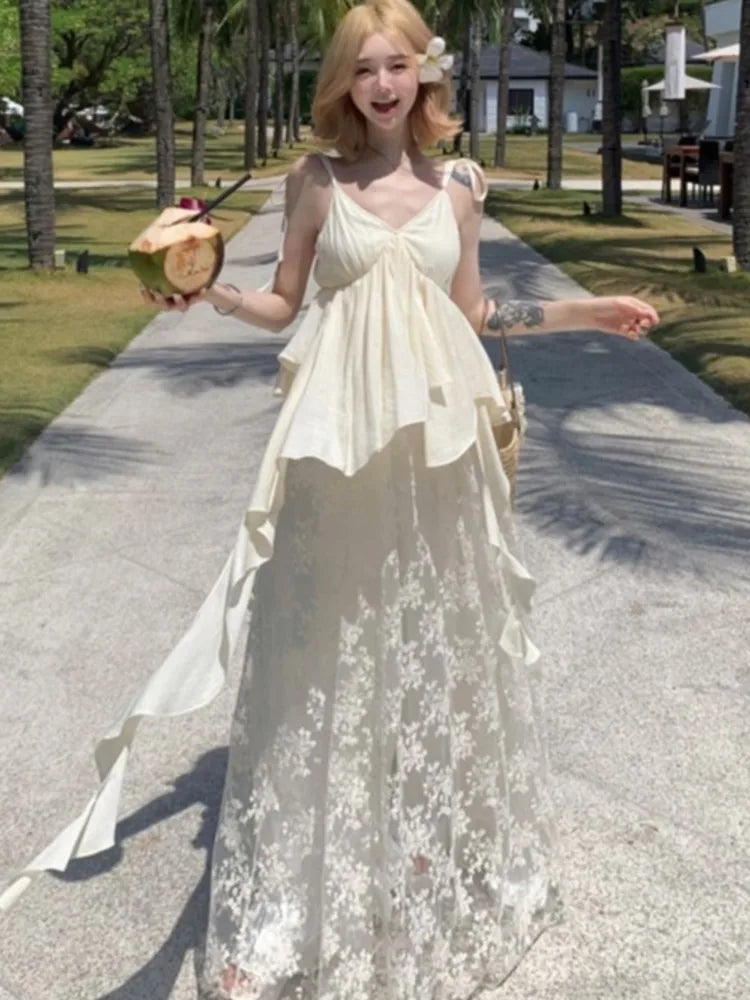Lunivop Korea Style Straps Vestidos Playa Mujer Women's Sexy Lace Beach Embroidered V-Neck Patchwork Dresses A-line Party Dress