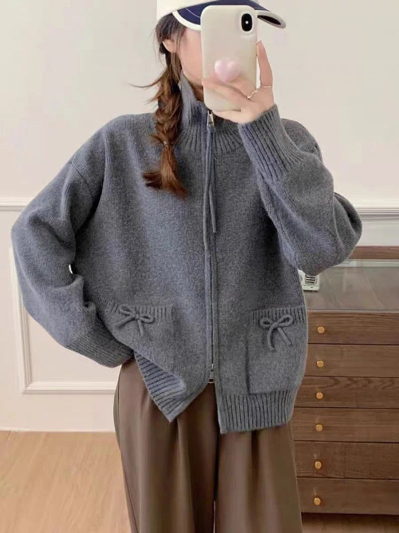 Lunivop Korean Bow Cardigan Women Lazy Wind Double Zipper Long Sleeve Knitted Jacket Vintage Sweet Casual Preppy Style Tops Coat