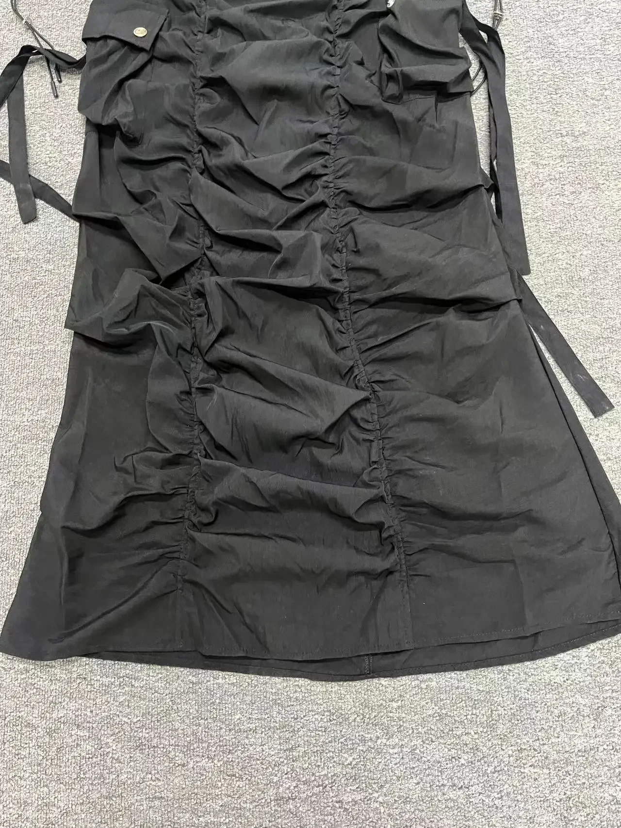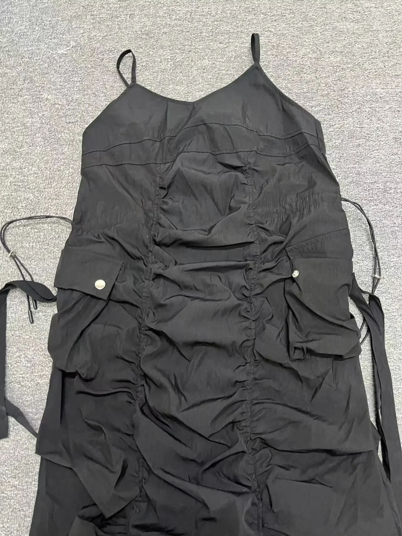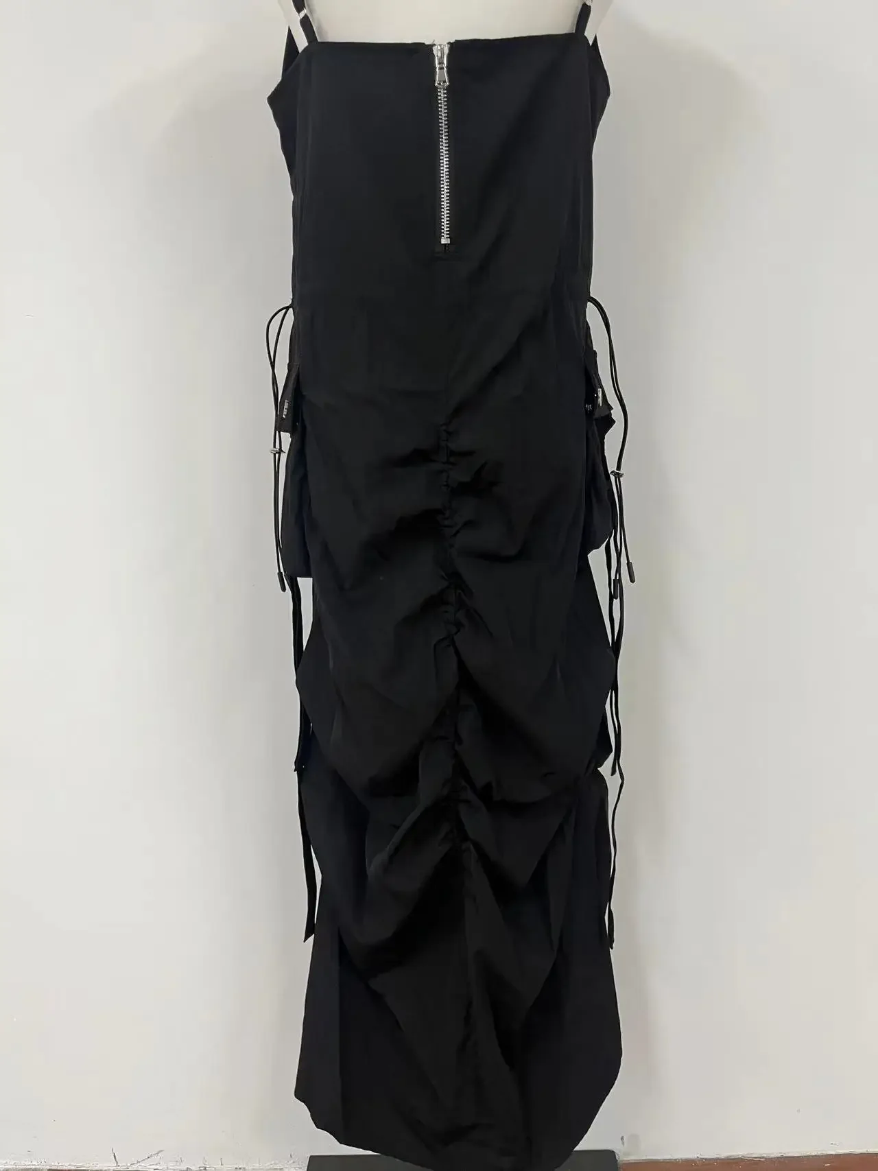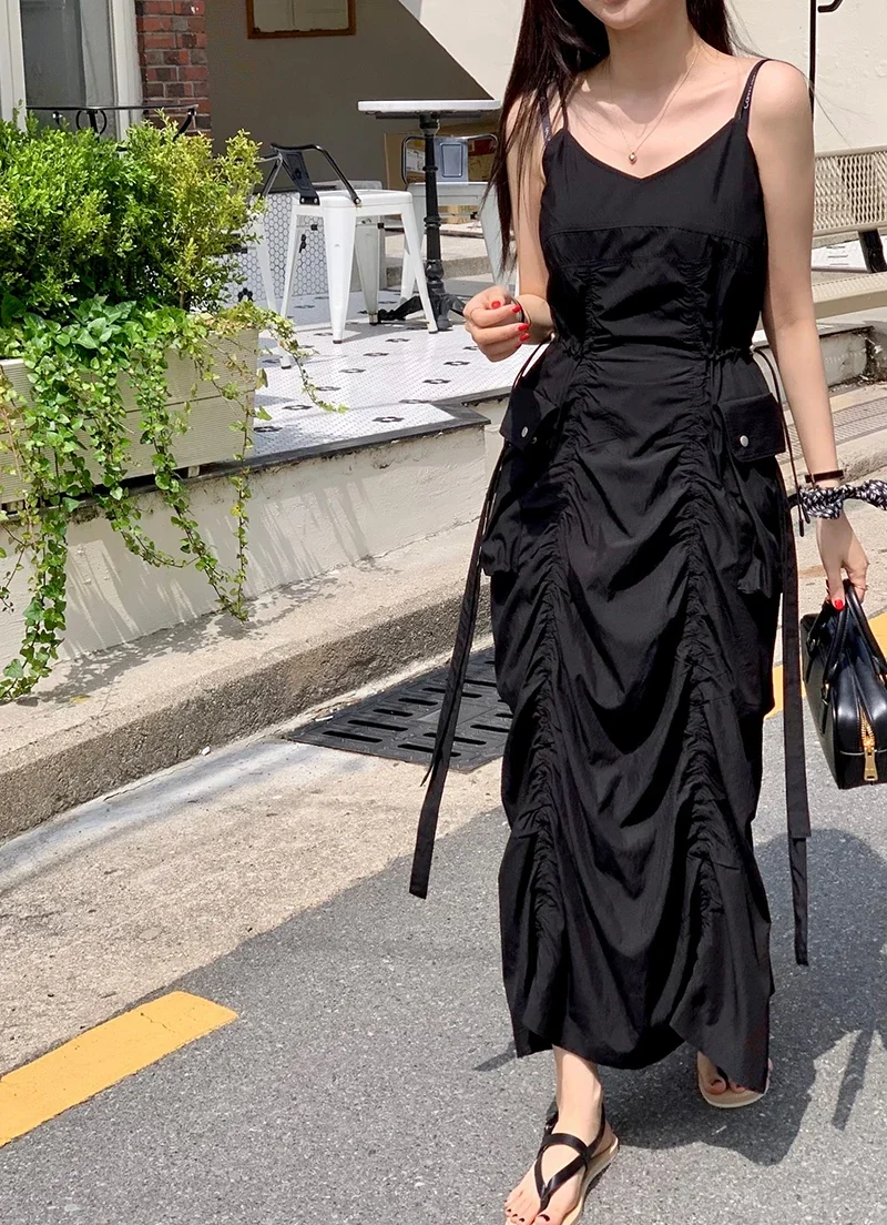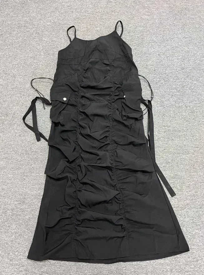 Lunivop Korean Fashion New Summer Dress Women Pleated Design Large Pockets Waisted Midi Dress Female Sleeveless Solid Black Long Dresses