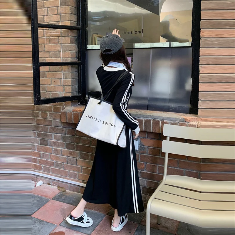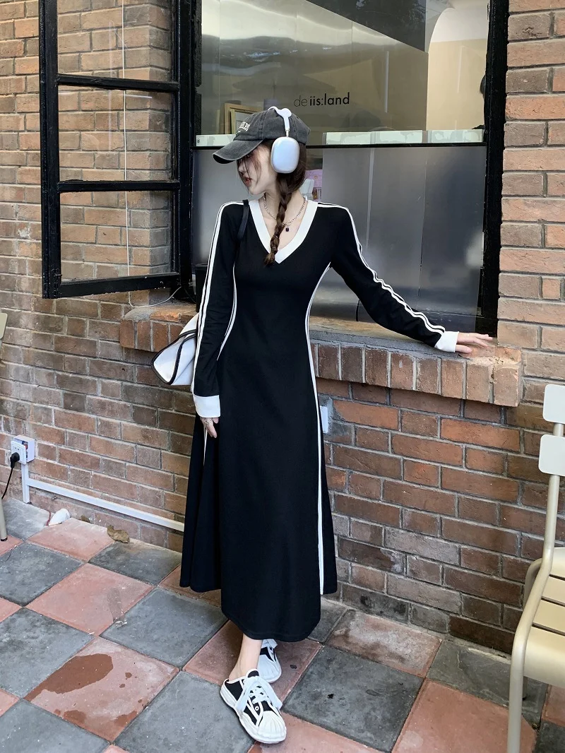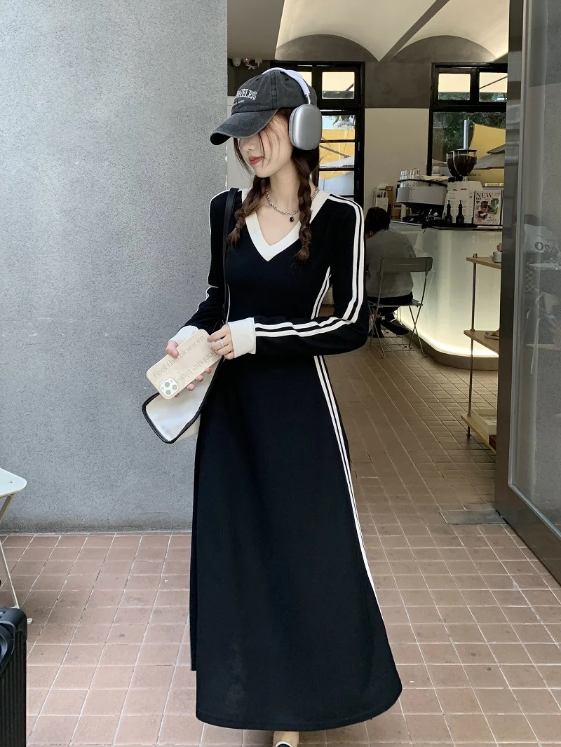 Lunivop Korean Fashion Striped V-neck Long Sleeve Dress Women Autumn Casual Loose Pacthwork Long Dresses Y2k Clothing Vestidos De Fiesta