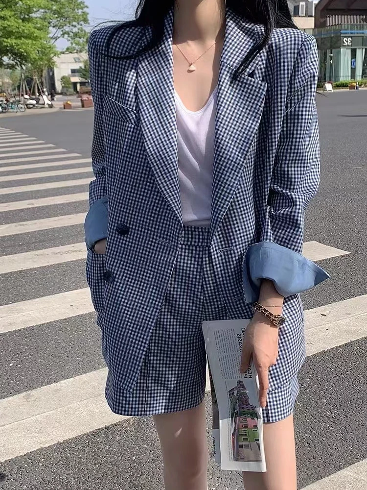 Lunivop Korean Fashion Two Pieces Blazer and Shorts Set for Women Long Sleeve Blue Plaid Jacket Office Lady Casual 2 Pieces Spring