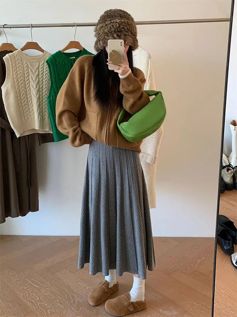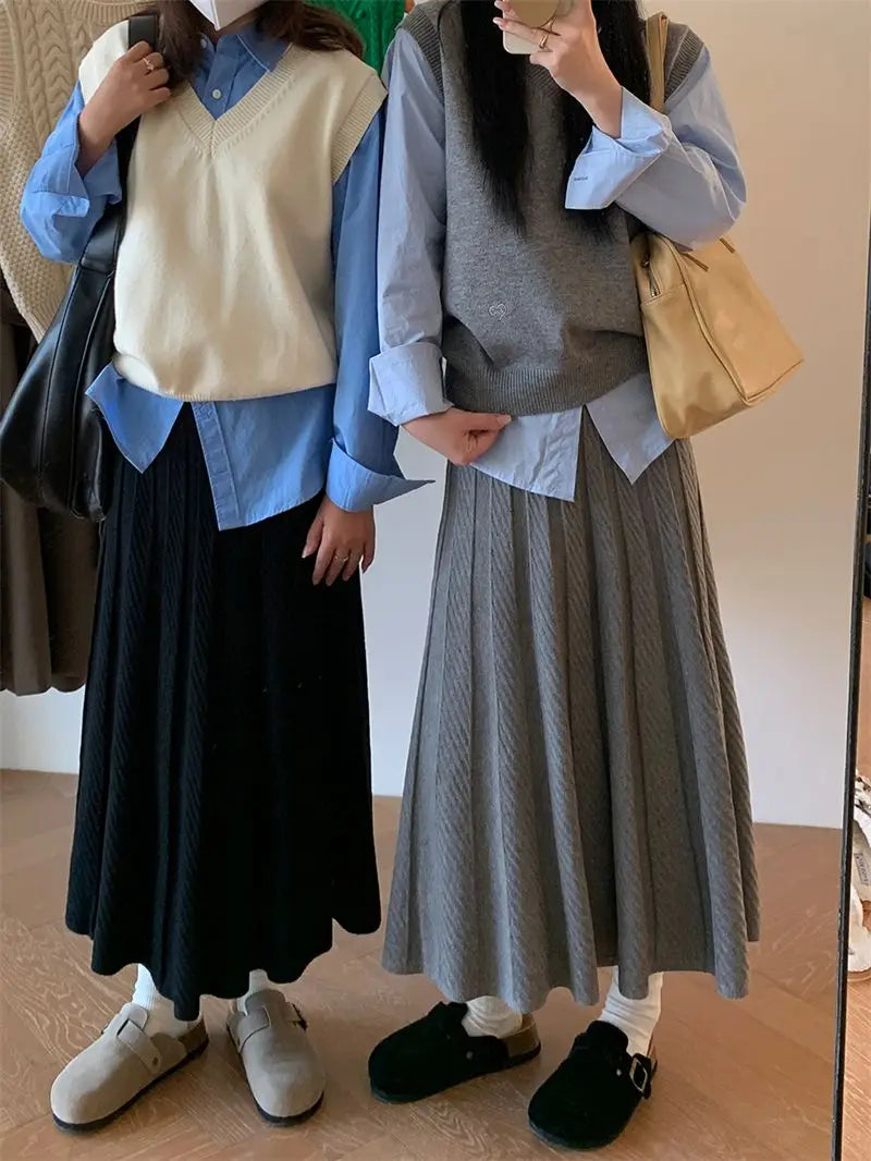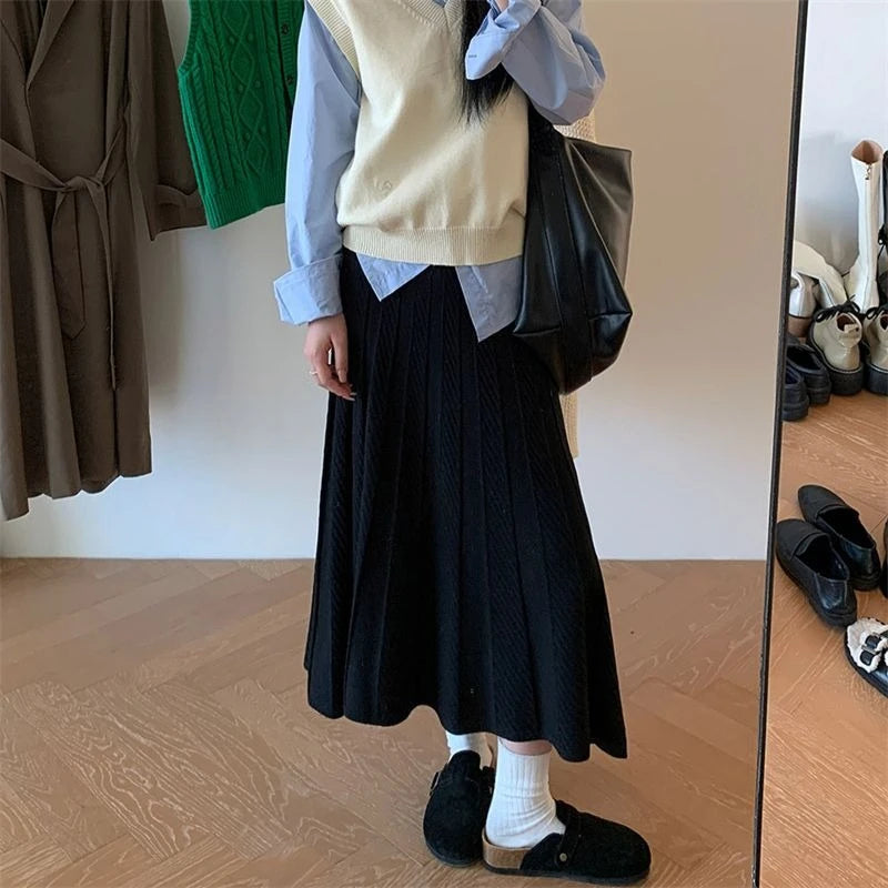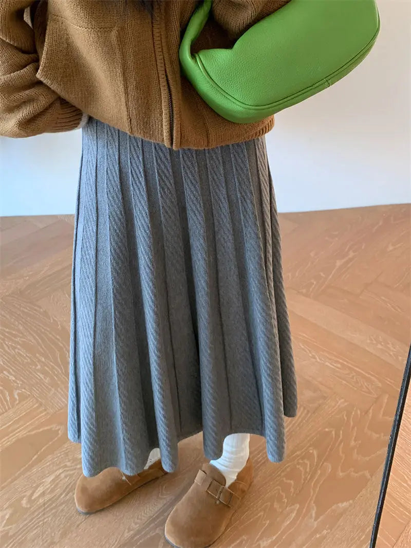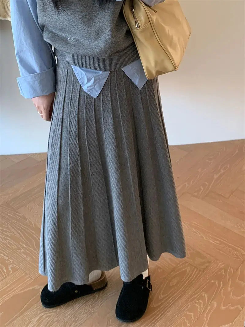Lunivop Korean Style Pleated Skirt Women Grey Elegant Sweet Knitted Skirt Preppy Style Autumn Winter Casual Solid Long Skirts