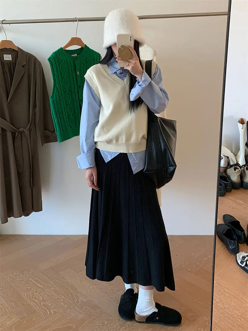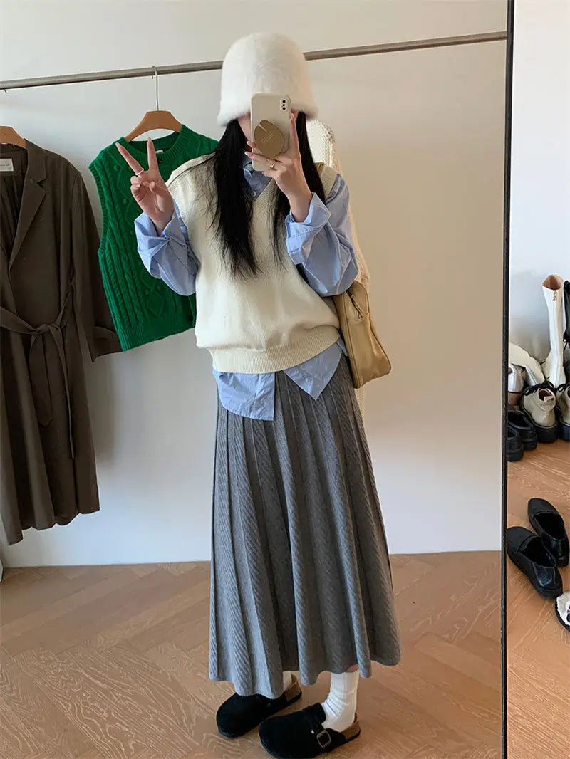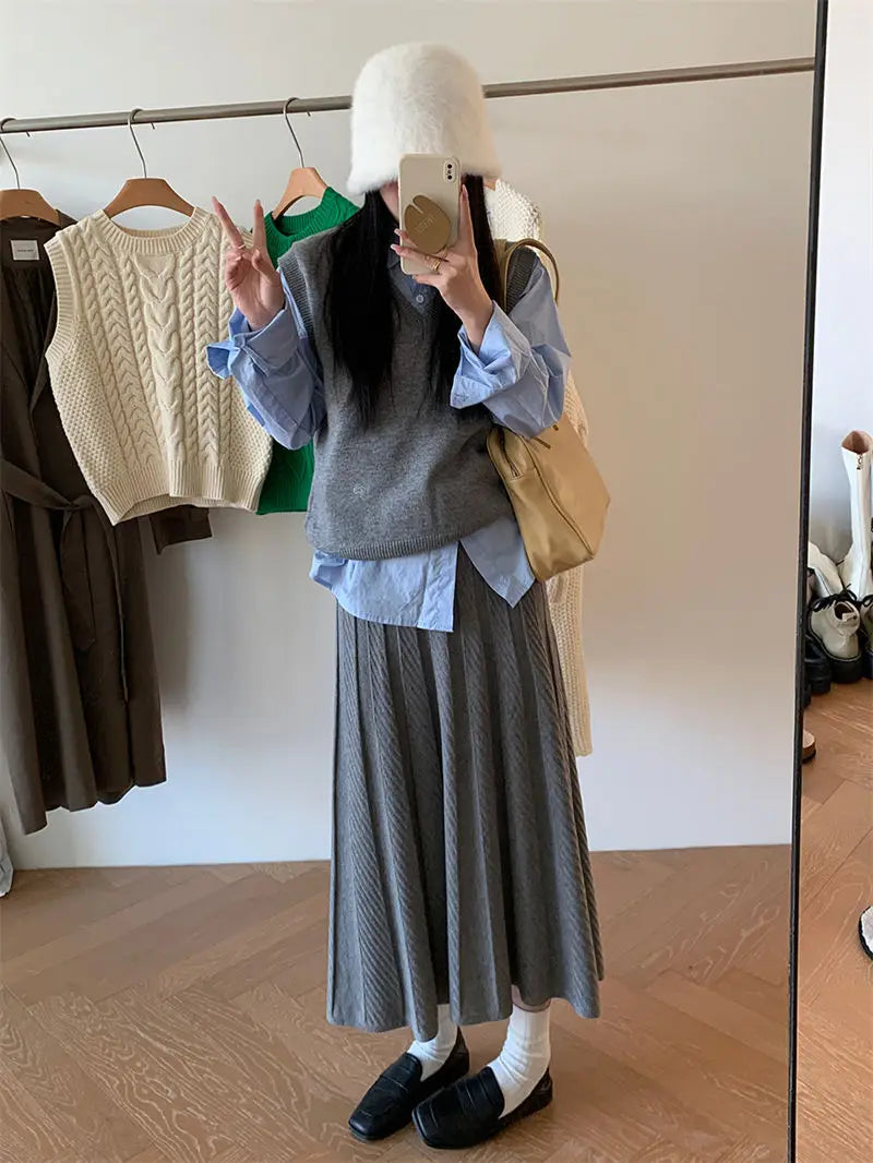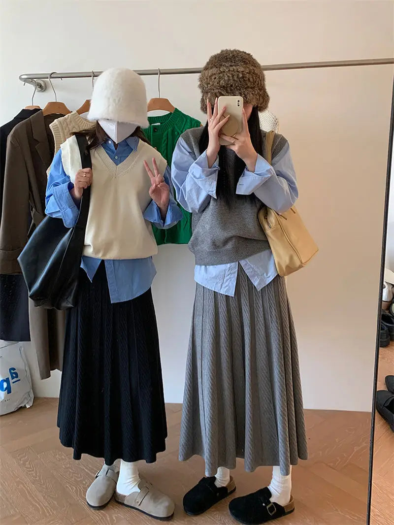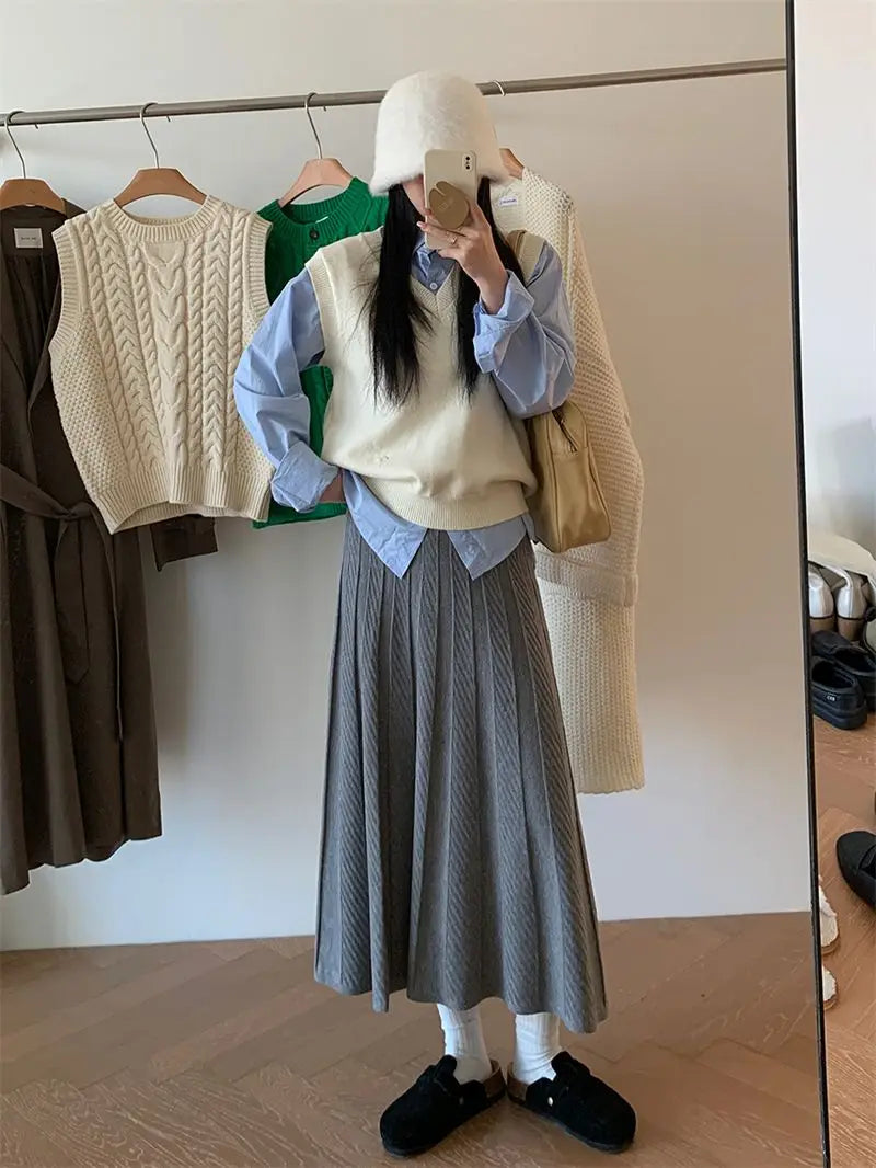 Lunivop Korean Style Pleated Skirt Women Grey Elegant Sweet Knitted Skirt Preppy Style Autumn Winter Casual Solid Long Skirts