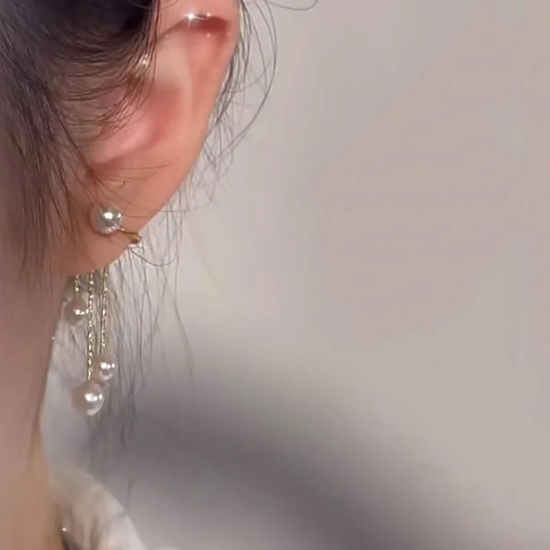 Lunivop Korean Trendy Pearl Golden Long Tassel Earrings for Women Exquisite Alloy Ear Clip Sweet Elegant Party Jewelry Wedding Gifts