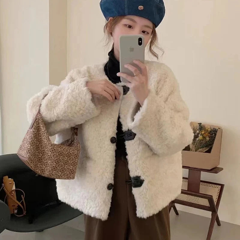 Lunivop Korean Winter Faux Lamb Coat Women Slim Long Sleeve Warm Sweet Jacket Preppy Style Casual O Neck Female Cute Solid Tops New
