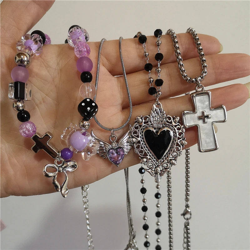 Lunivop Kpop Cute Aesthetic Heart Bow Cross Pendant Purple Bead Necklace Egirl Goth Vintage 2000s Y2K EMO Rave Jewelry Scene Accessories