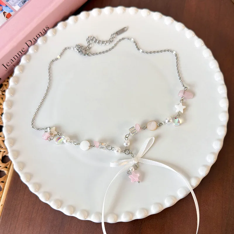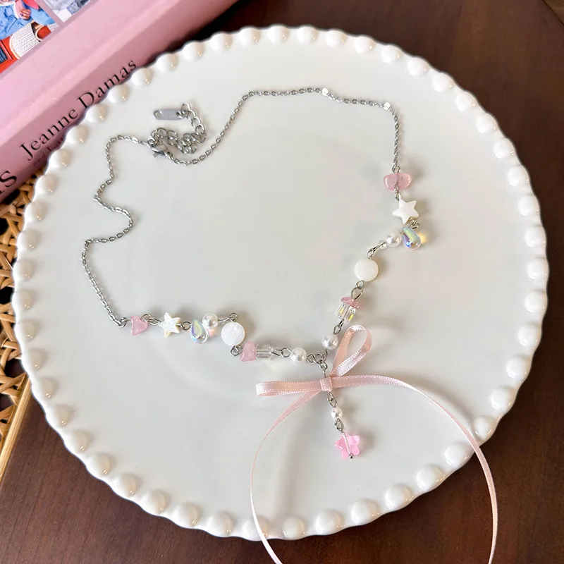 Lunivop Kpop Goth Y2K Star Bowknot Pendant Pearl Bead Lolita Clavicle Chain Choker Necklace For Women Harajuku Charm EMO 2000s Jewelry