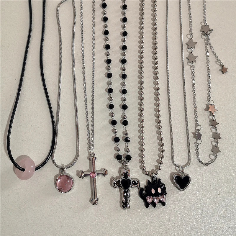 Lunivop Kpop Punk Goth Black Cat Pink Crystal Cross Heart Pendant Star Chain Necklace Men Women Hip Hop 2000s Y2K Grunge EMO Accessories