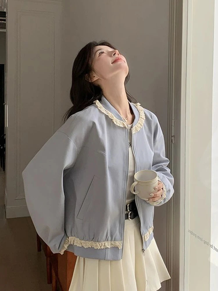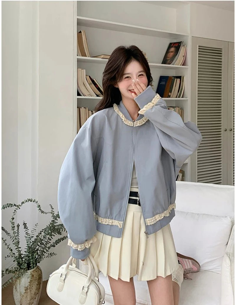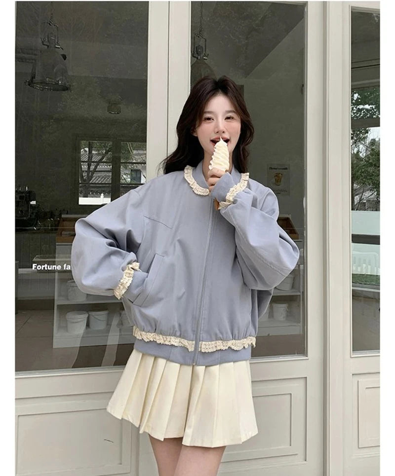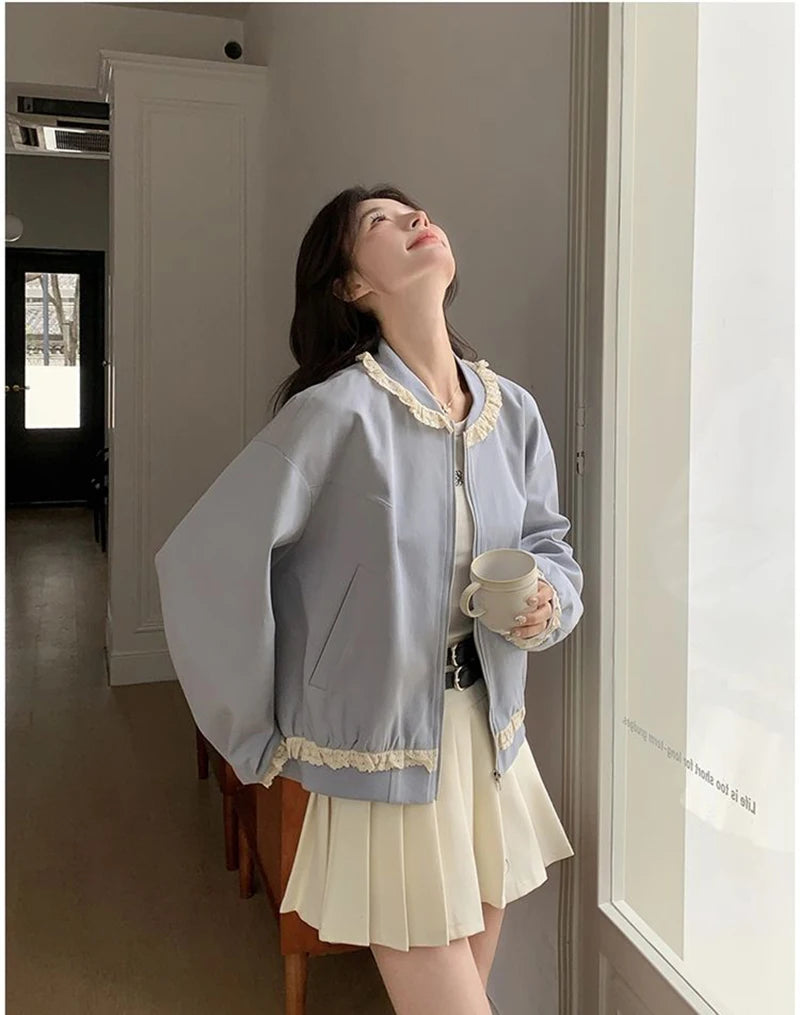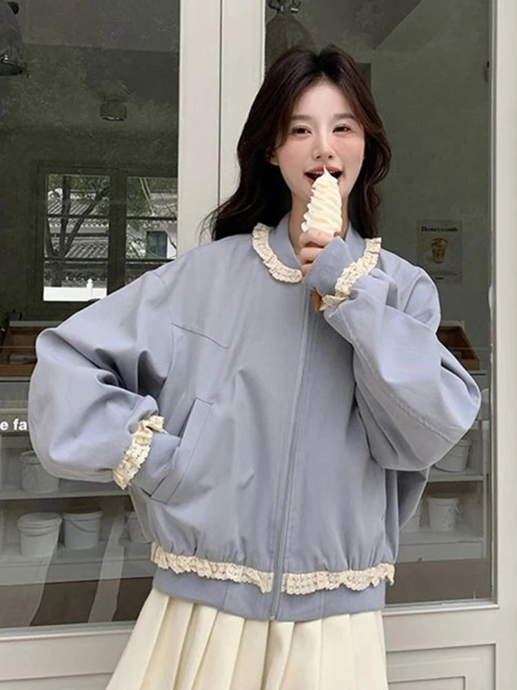 Lunivop Lace Patchwork Sweet Jacket Women Loose Vintage Preppy Style Cute Coat Female Long Sleeve Korean Retro O Neck Tops Outwear
