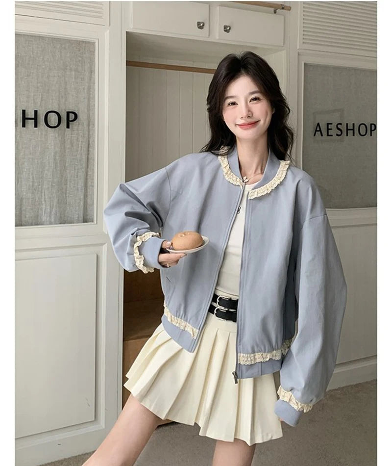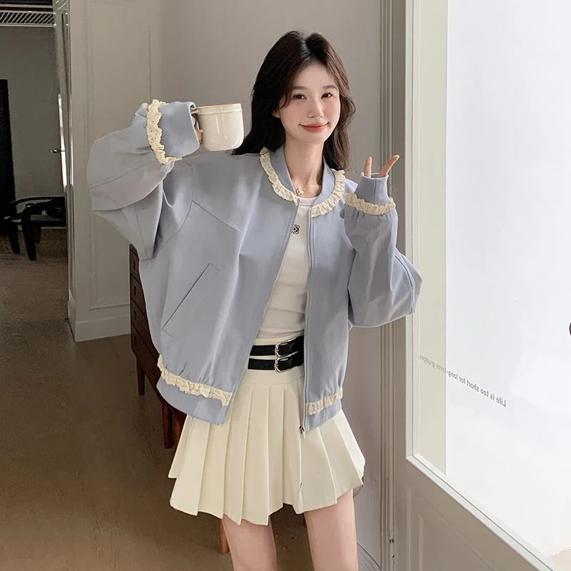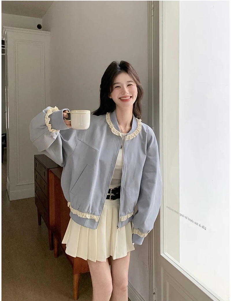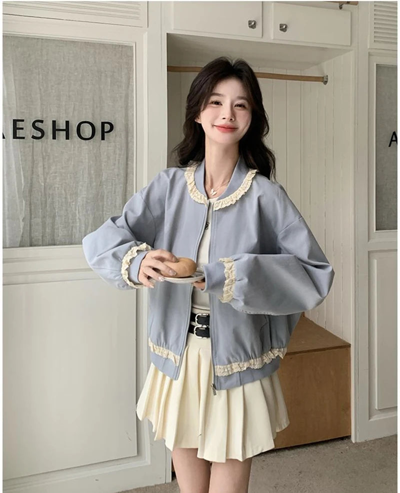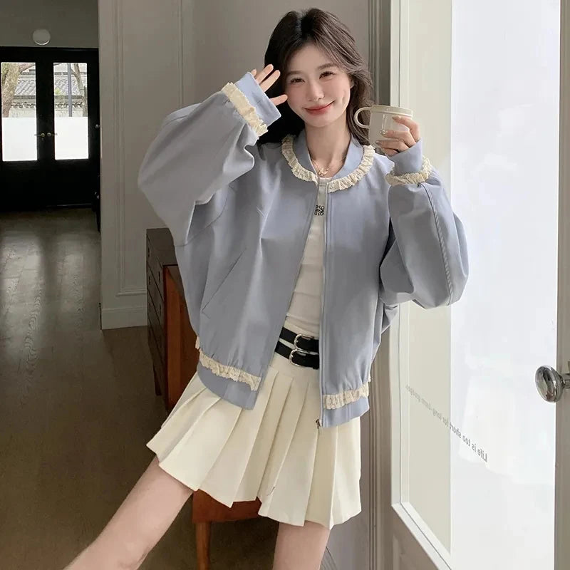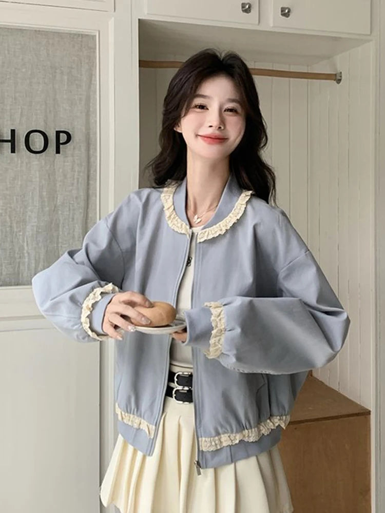 Lunivop Lace Patchwork Sweet Jacket Women Loose Vintage Preppy Style Cute Coat Female Long Sleeve Korean Retro O Neck Tops Outwear