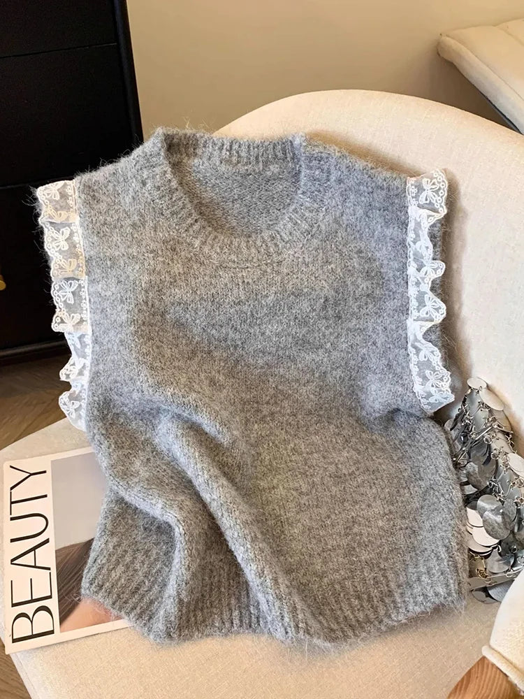 Lunivop Lace Patchwork Sweet Sweater Vest Women Vintage O Neck Casual Knitted Tops Korean Preppy Style Lady Lazy Wing Cute Vest New