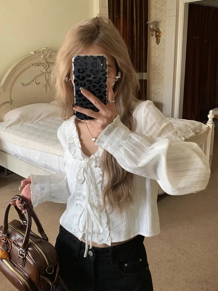 Lunivop Lace Up Sweet White Shirts Women Vintage Long Sleeve Cropped Blouse Casual V Neck Female Korean Elegant Retro Tops New