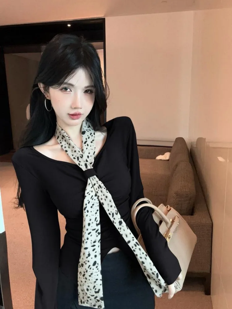 Lunivop Leopard Print Ribbon All-match Tops Mujer Ealy Autum New Bottoming T-shirt for Women Y2k Slim Fit Long Sleeve Tee Shirt
