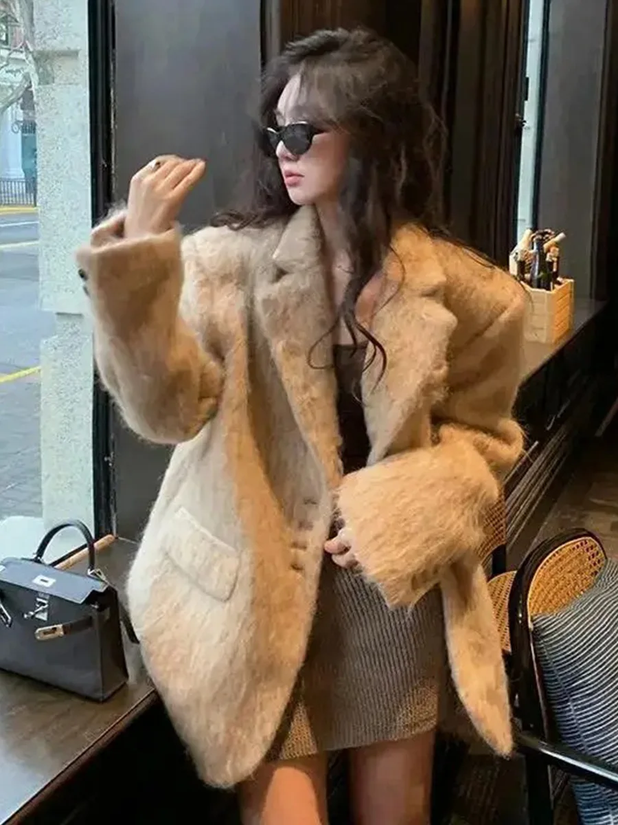 Lunivop Loose Lapel Plush Jacket Female 2024 Autumn Winter New Warm Solid Button Long Sleeve Coat Office Lady Outwear Elegant