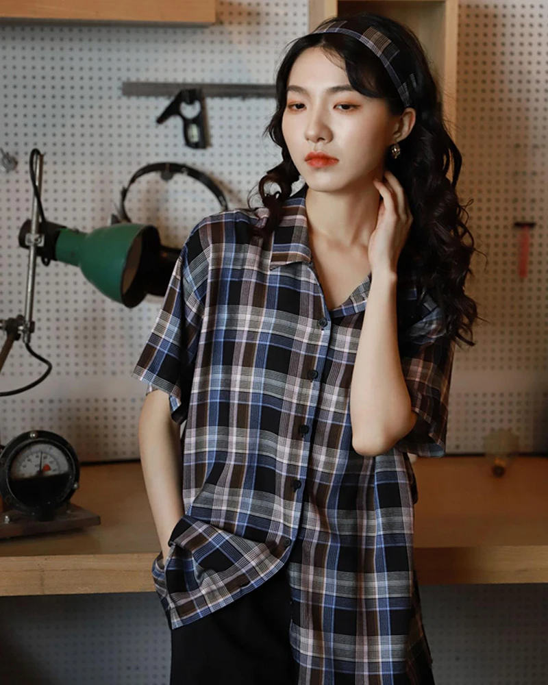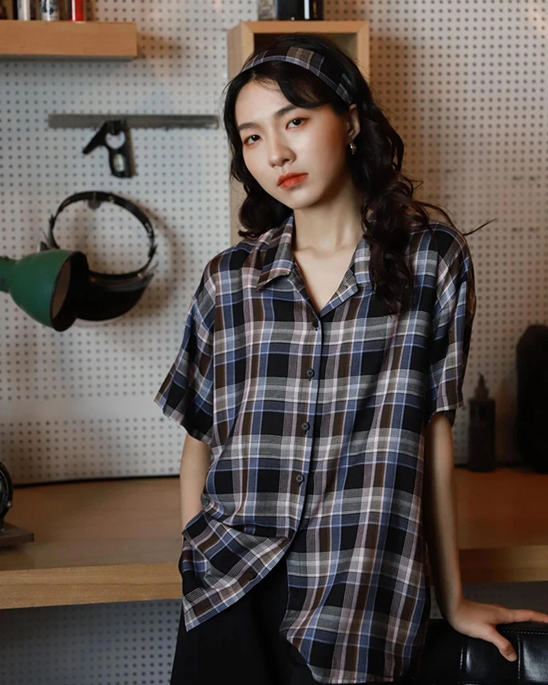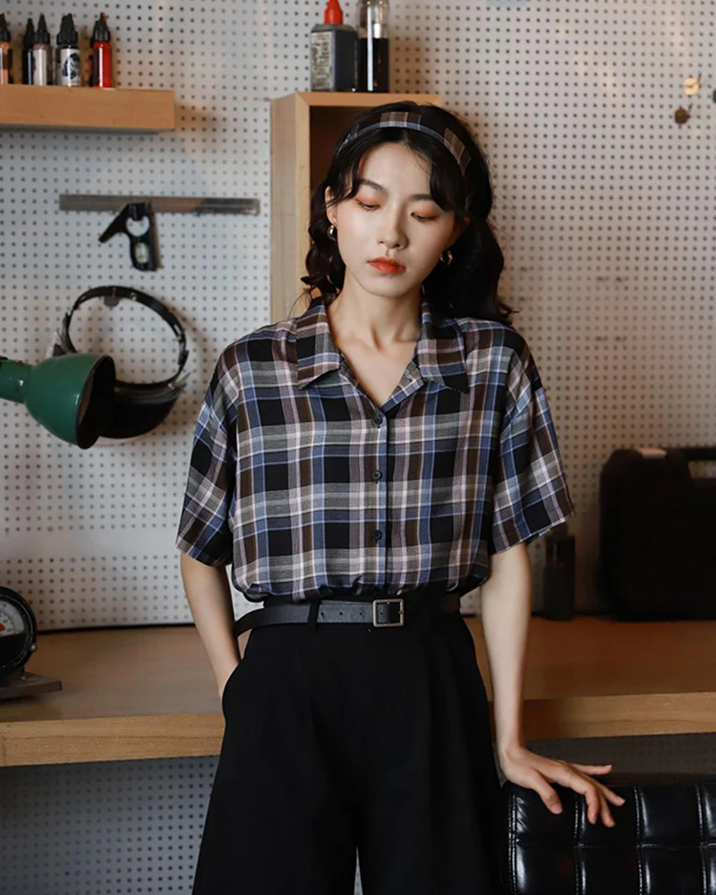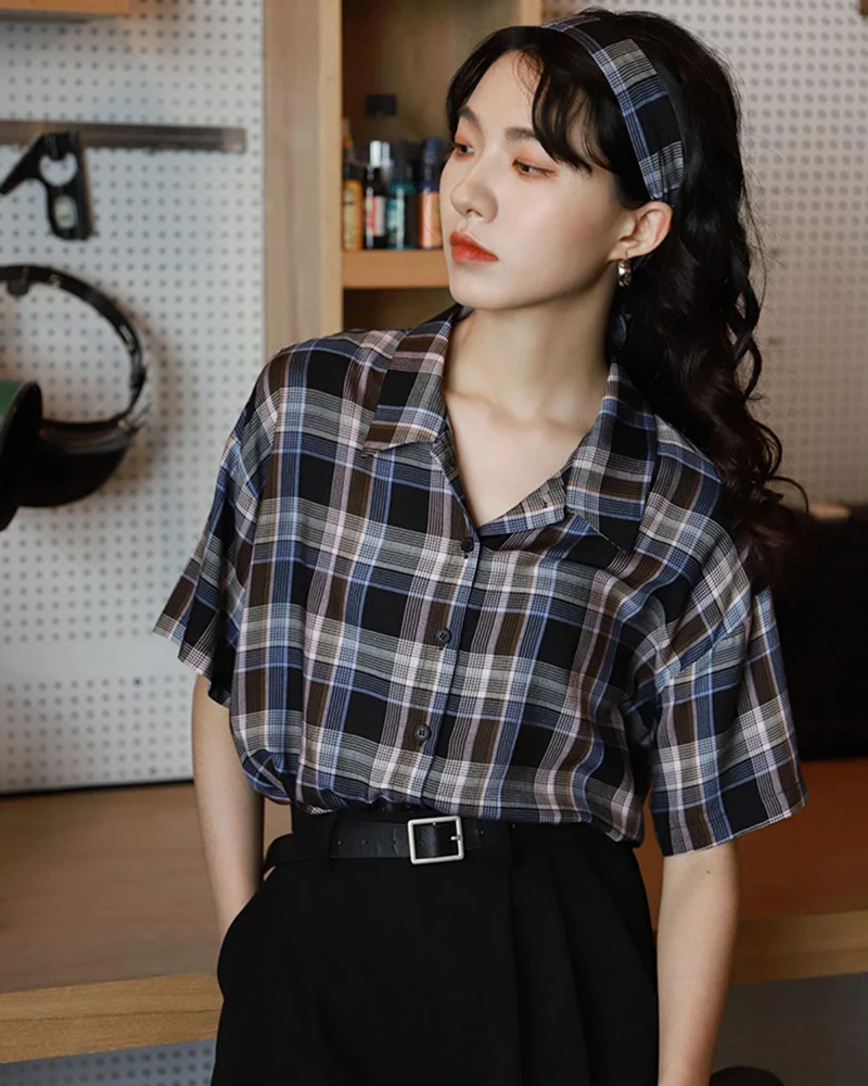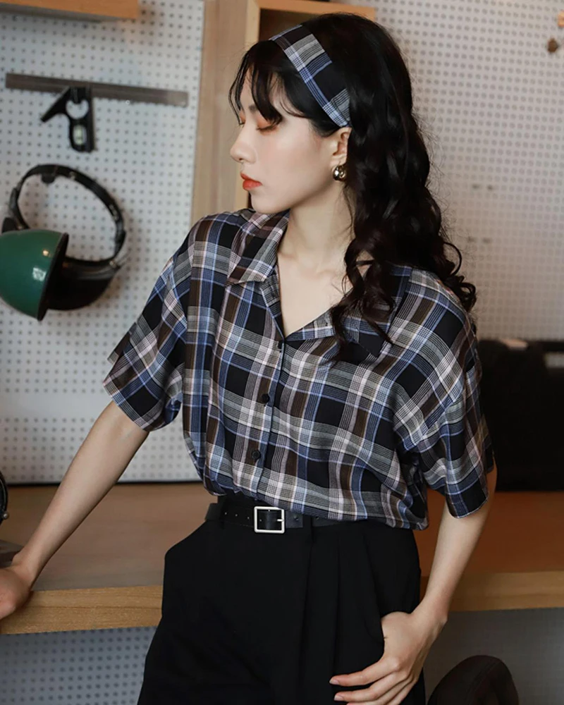 Lunivop Loose Retro Plaid Shirt Women Short Sleeve Casual Vintage Blouse Summer All Match Japan Preppy Style Single Breasted Tops