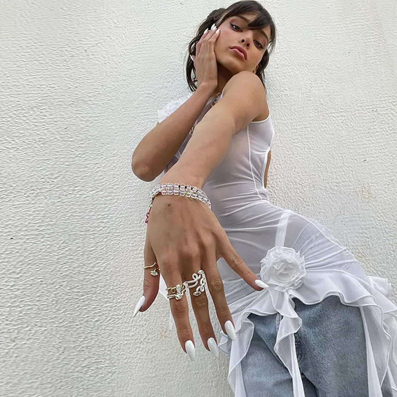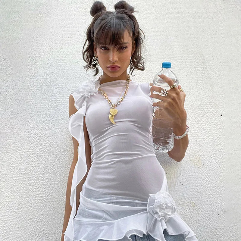 Lunivop Mesh See Through Backless Sleeveless Floral Pattern Long Tassel Women'S Top T Shirt Summer Casual Y2K Streetwear Clothes