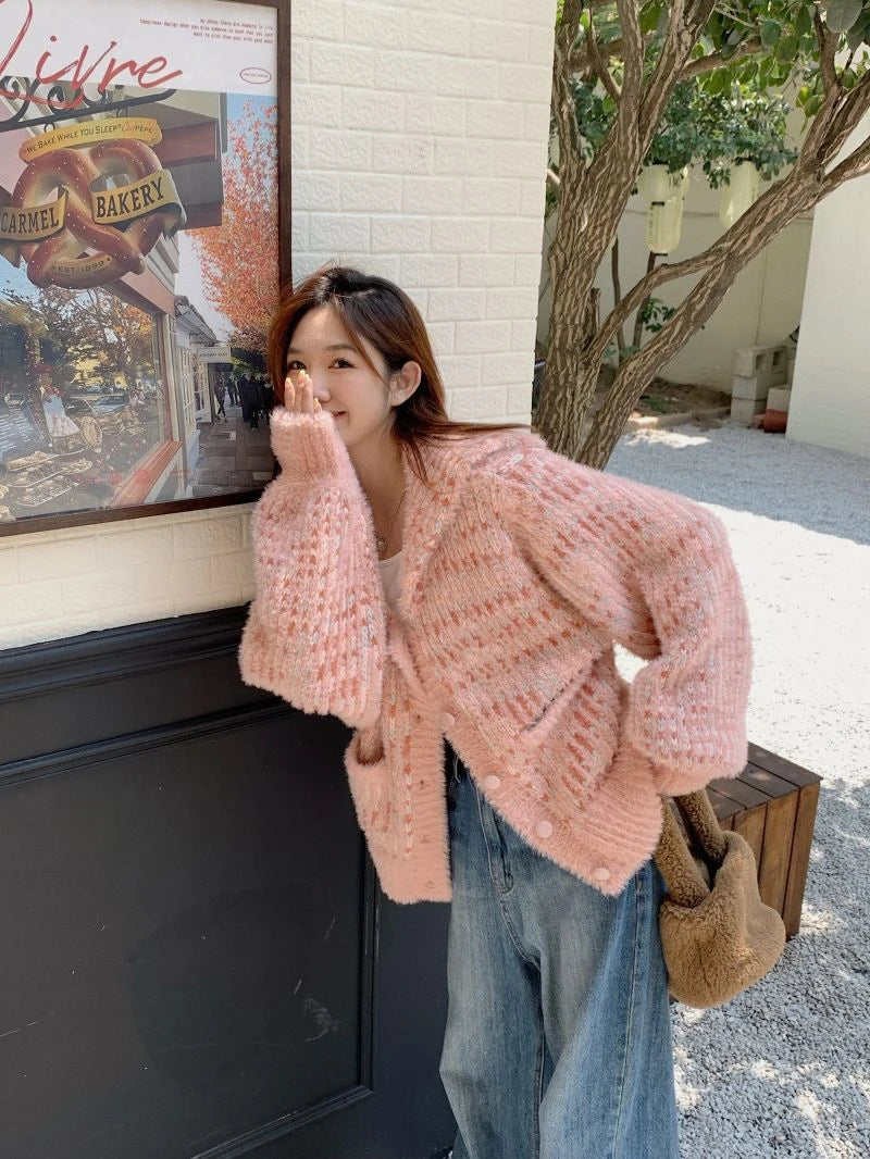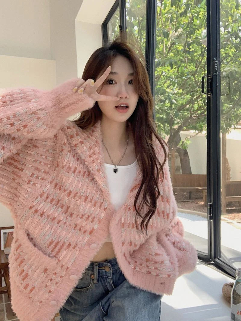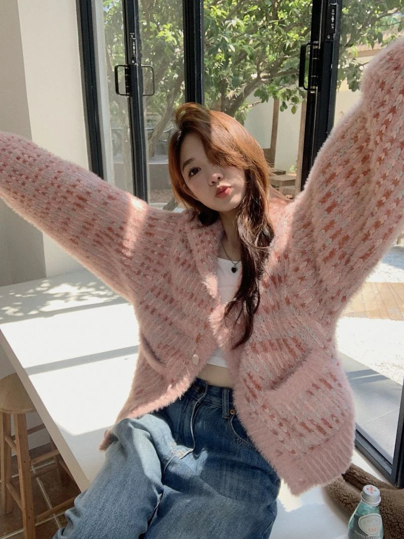 Lunivop Mohair Sweet Pink Cardigan Sweater Women Elegant Lazy Wind Chic Knitted Coat Loose Long Sleeve Fashion High Quality Tops