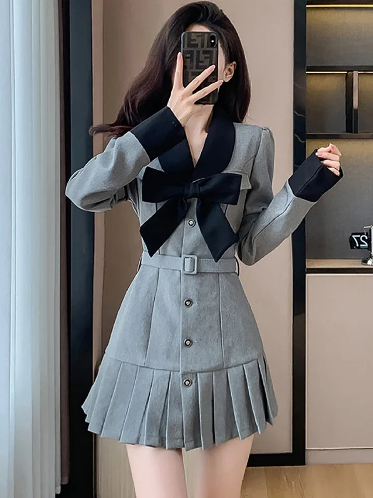 Lunivop New Chic Bow Y2k Mini Pleated Dress Women Long Sleeve Bodycon Casual Prom Clothes Autumn Winter Korean Elegant Party Dress