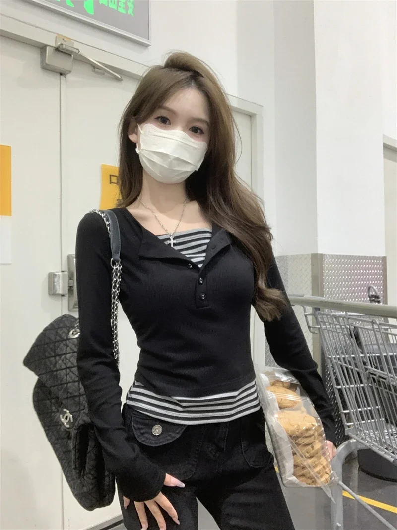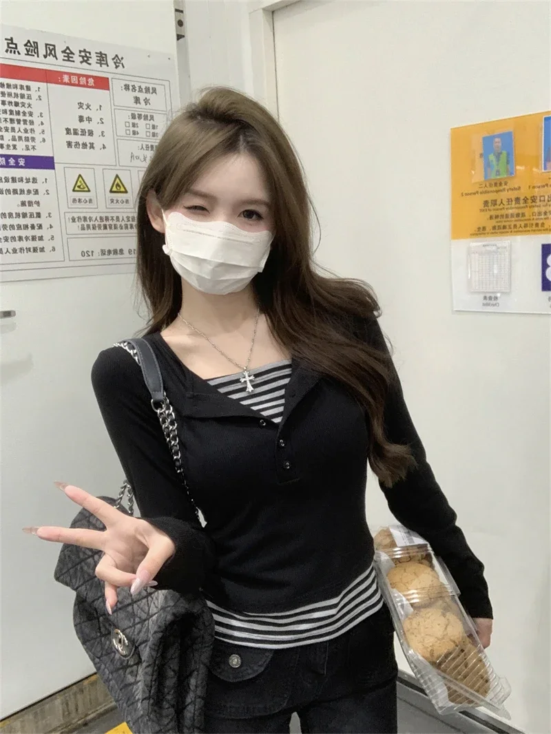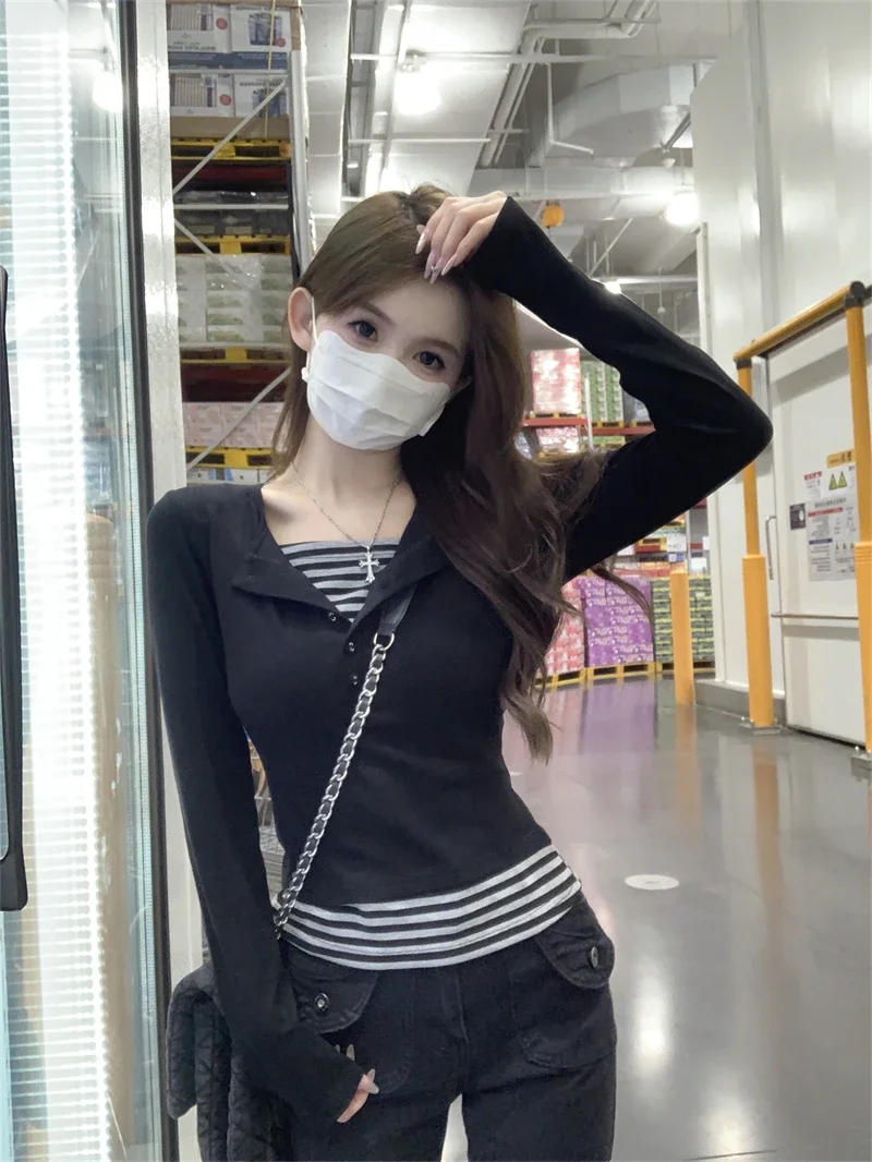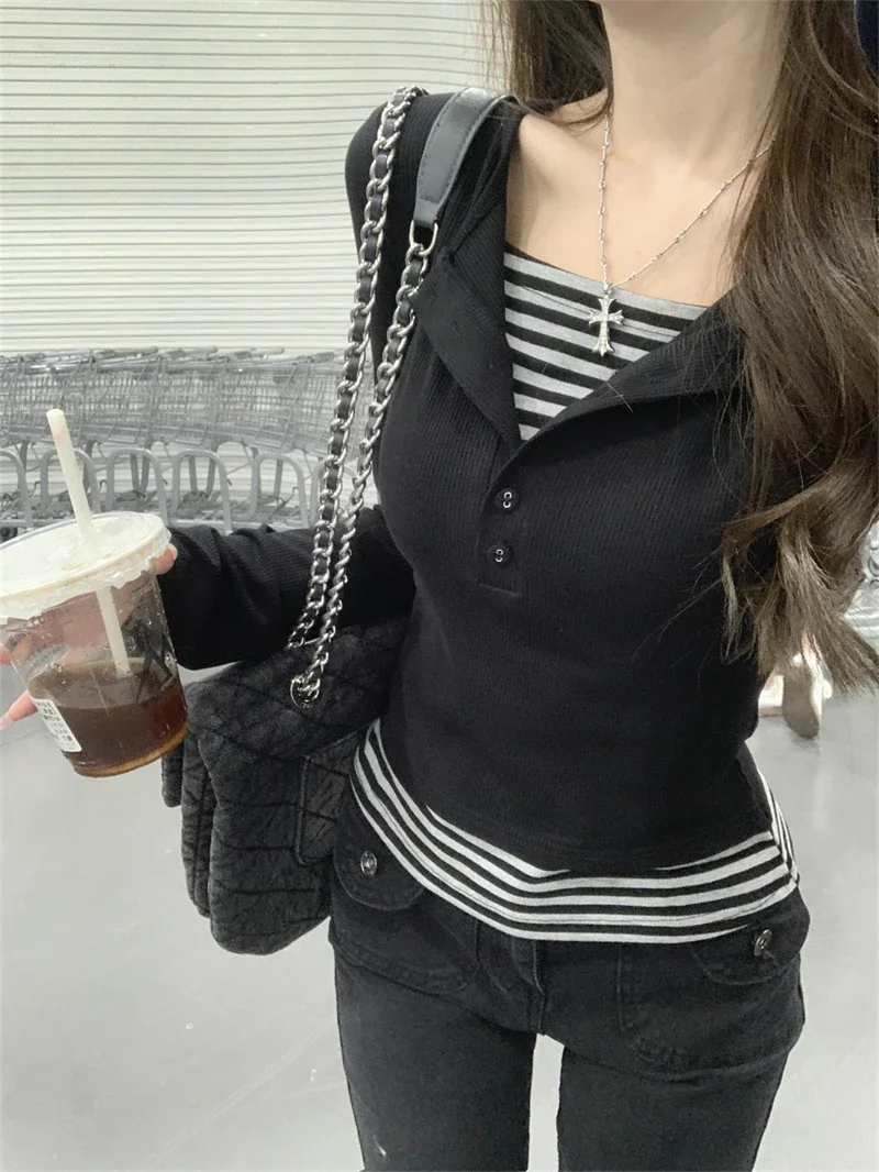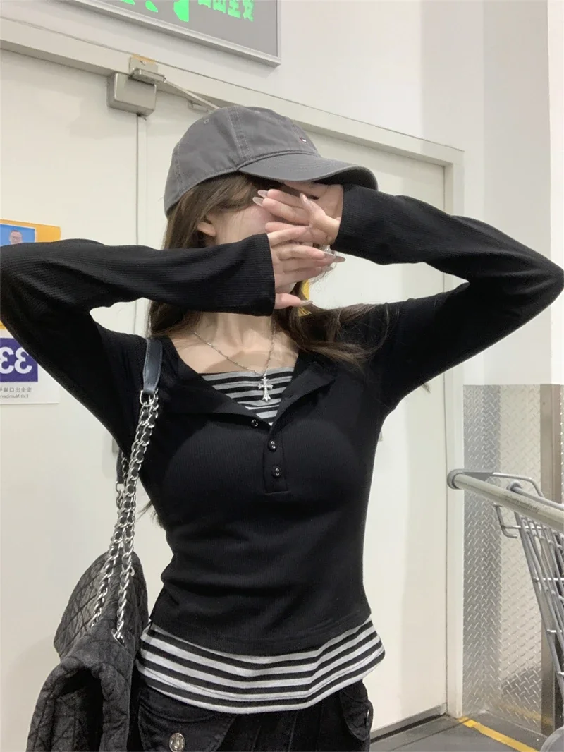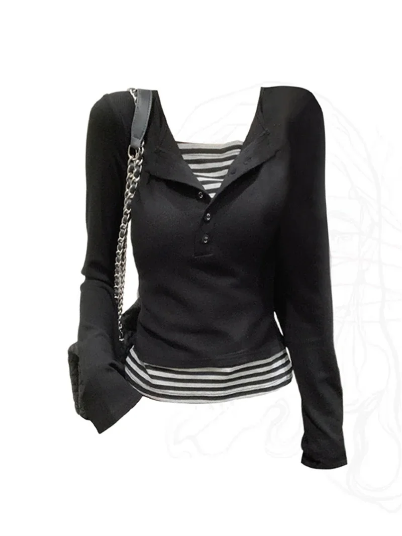 Lunivop New Design Fashion T-Shirts Women Square Collar Fake Two Pieces Striped Top Long Sleeve Slim Casual Tees Vintage Blouse Y2K