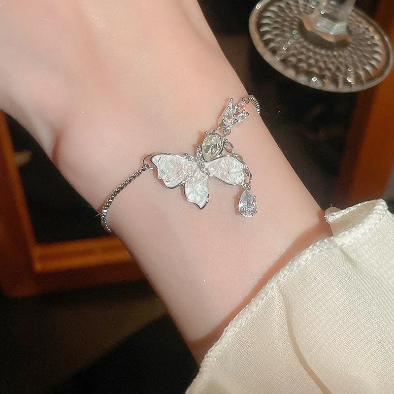 Lunivop New Fashion Gradient Pink Crystal Butterfly Stainless Steel Bracelet for Women Luxury Zircon Water Drop Pendant Bracelet Jewelry