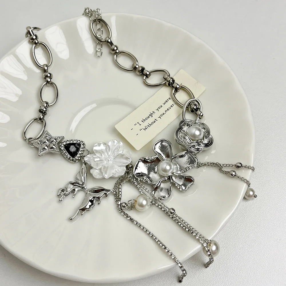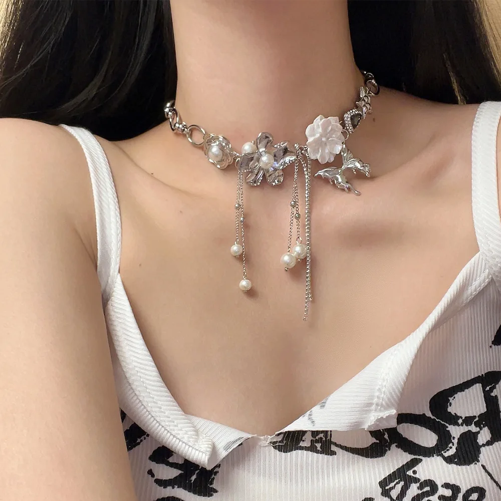 Lunivop New Romantic Elegant Flower Tassel Necklace Metal Butterfly Vintage Pearl Choker Fashion Unisex Jewelry for Women