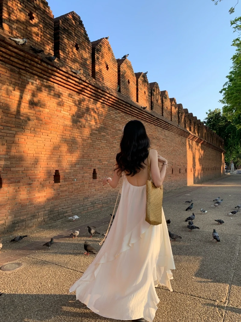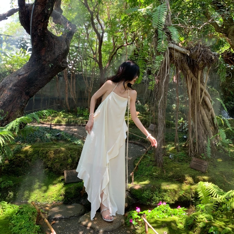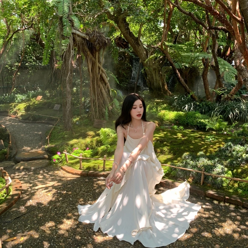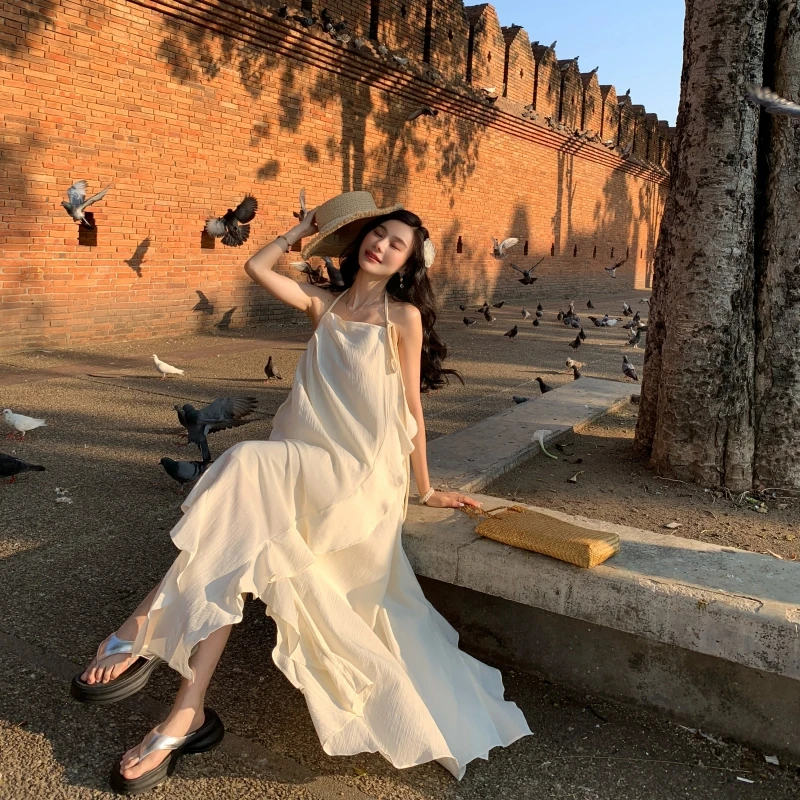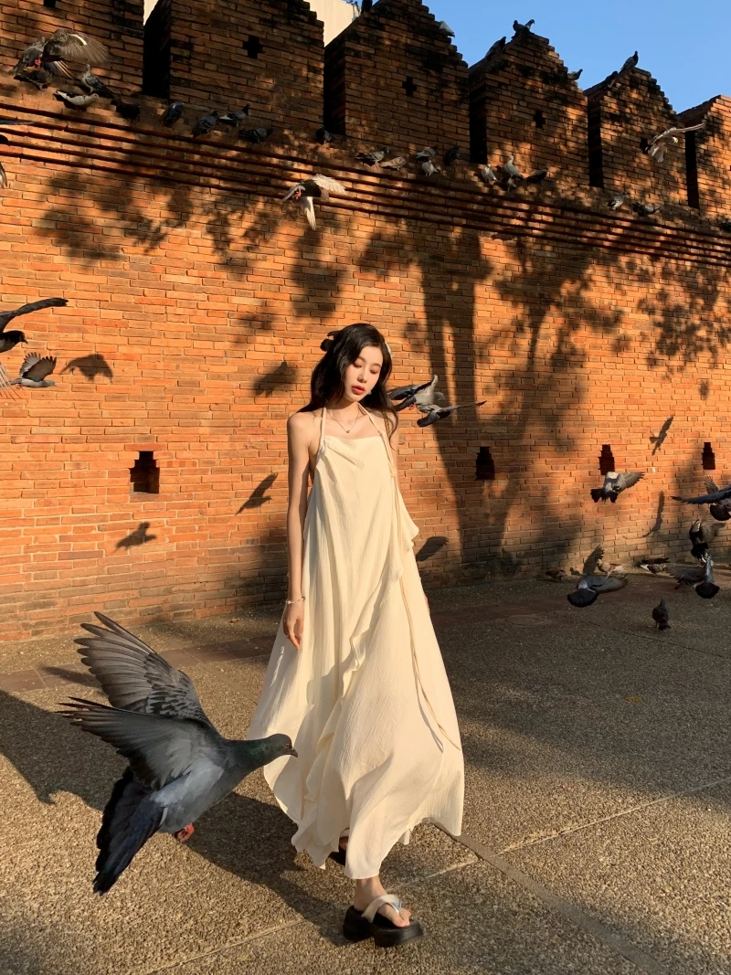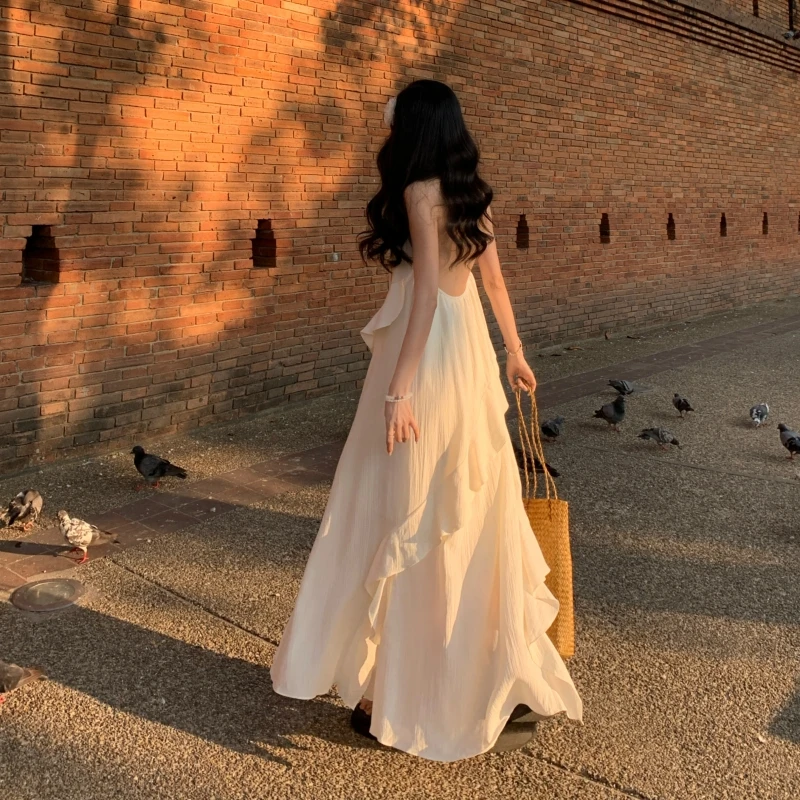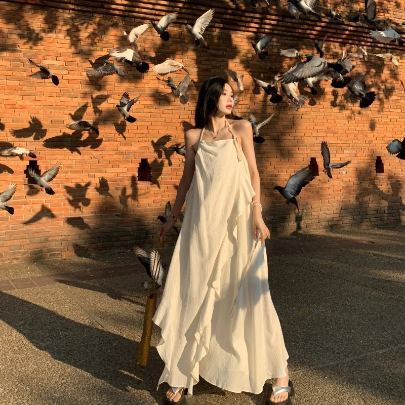 2024 New Summer Fairy Halter Designer Dress Women BeigeLong Lolita Birthday Party Dresses Vacation Female Backless Dresses