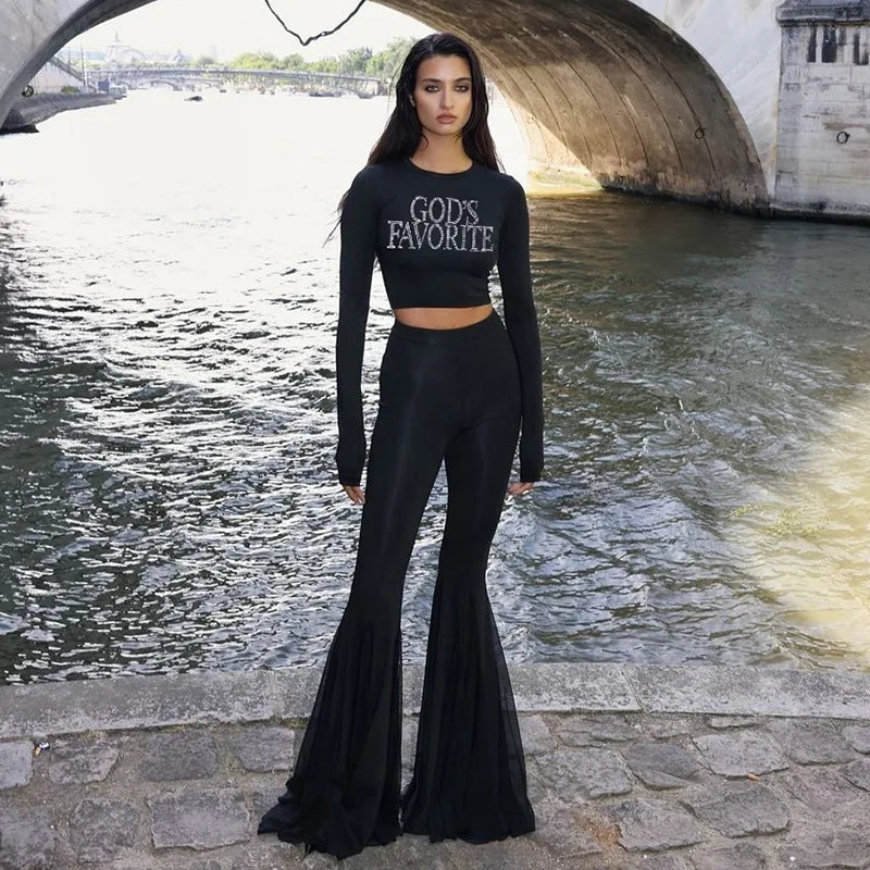Lunivop O Neck Diamonds Rhinestone Long Sleeve Tshirt Top Long Flare Pant Women'S Sets Autumn Casual Clothing Fashion Korean