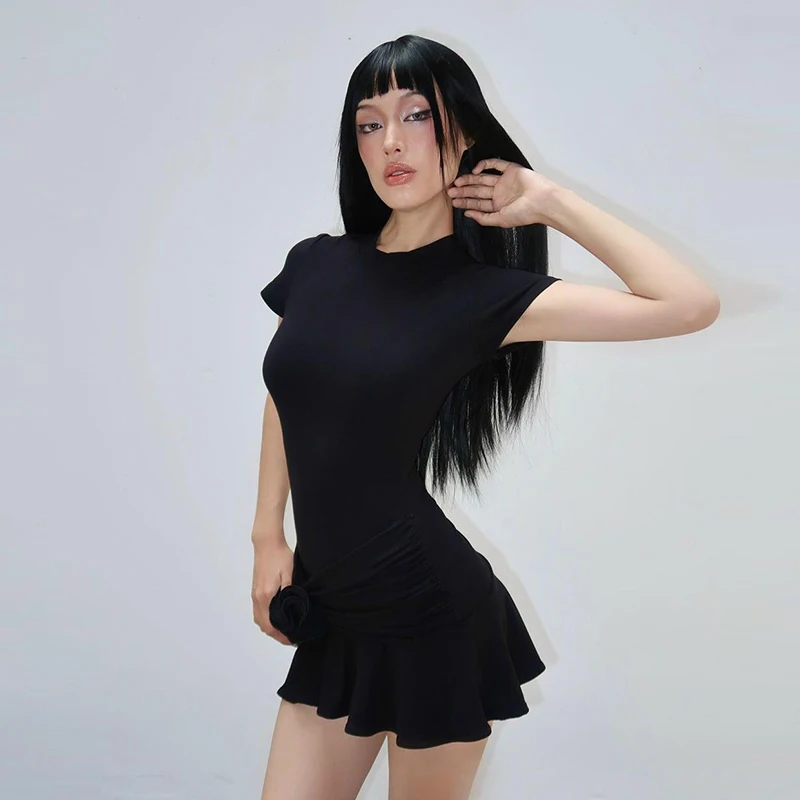 Lunivop O Neck Short Sleeve Ruched Floral Pattern Ruffles Short Dresses 2024 Summer Korean Y2K Streetwear Casual Fashion Clothes
