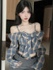 Lunivop Off Shoulder Bow Plaid Shirt Women Long Sleeve Slim Vintage Blouse Sexy Cropped Korean Female Sweet Retro Tops New Spring
