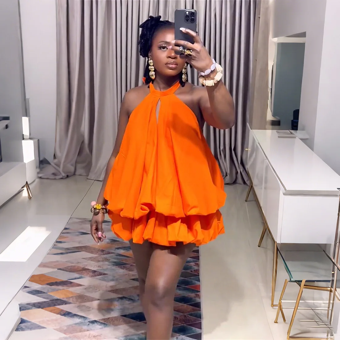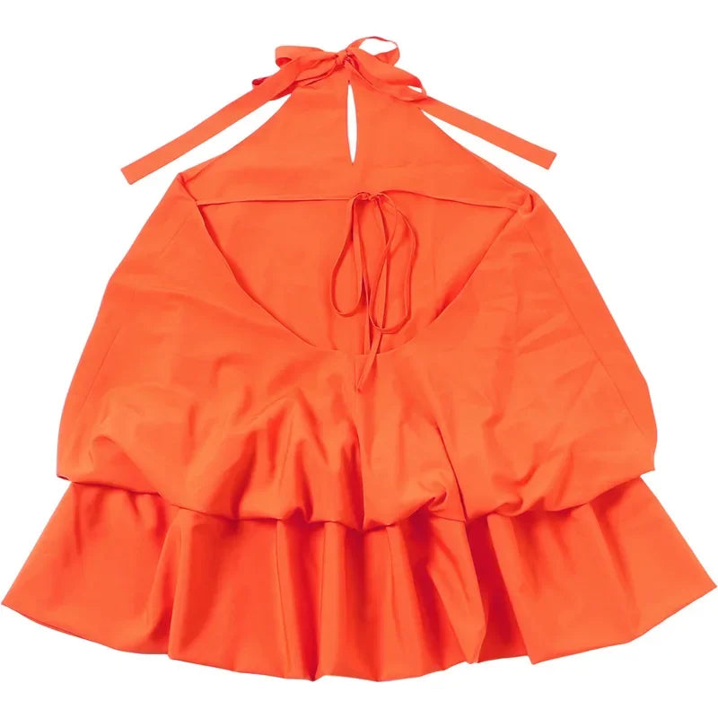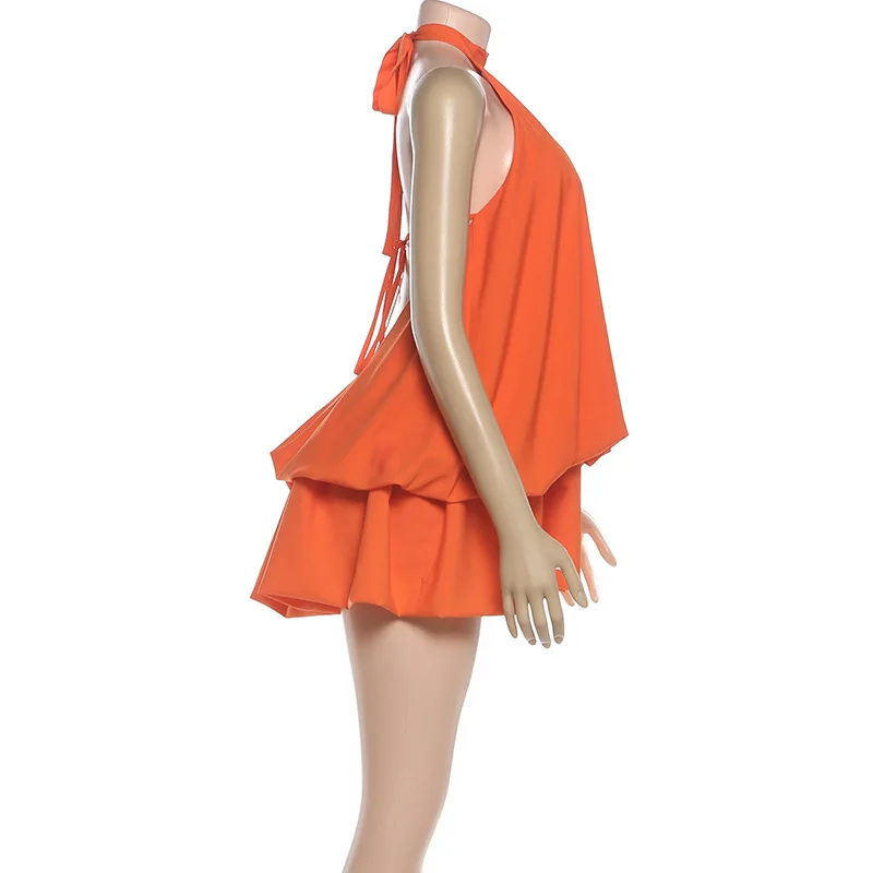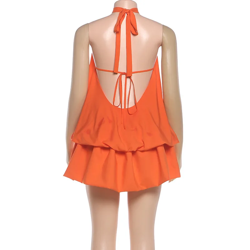 Lunivop Orange Lace Up Halter Backless Mini Cake Dress Hollow Out Sleeveless Pleated Lantern Party Outfits Women Solid Casual Streetwear