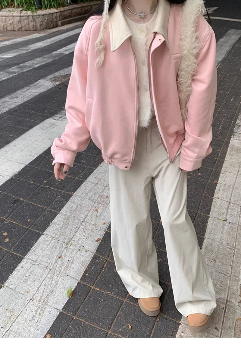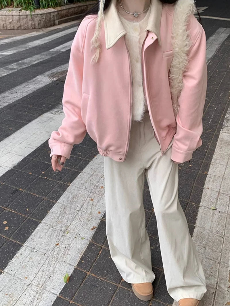 Lunivop Pink Faux Suede Jacket Women Sweet Long Sleeve Vintage Streetwear Baseball Coat Fall Casual Retro American Y2K Lady Outwear