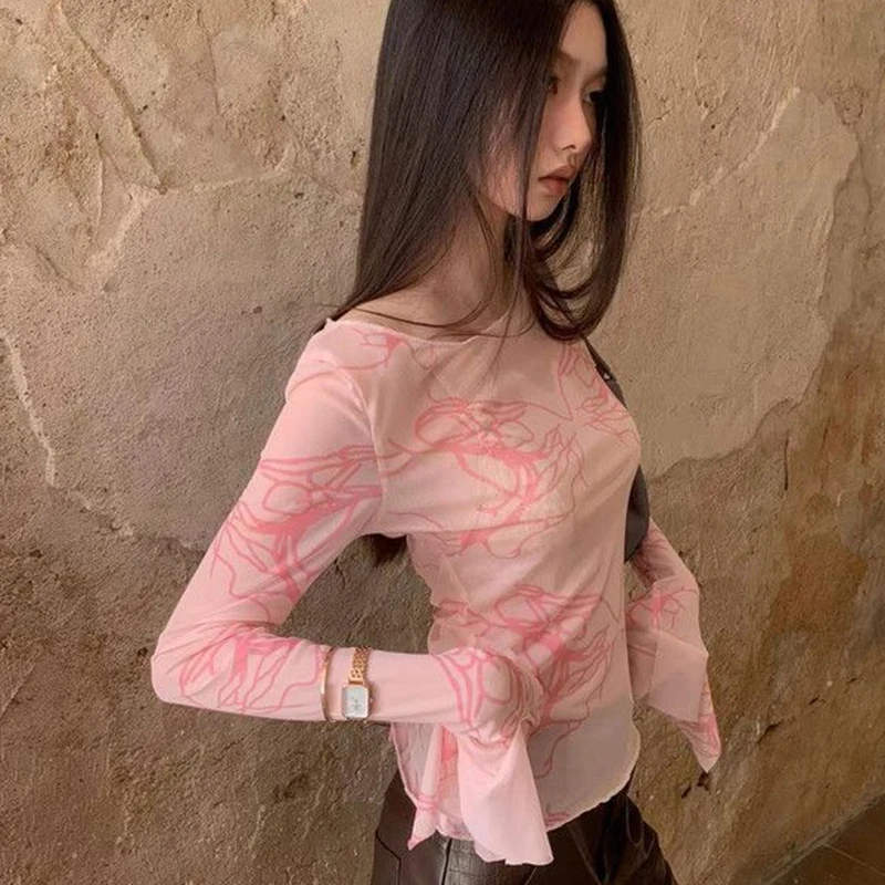 Lunivop Pink Tie Dye Mesh Tops Long Sleeve See Through T Shirt Women Clothes Y2k Grunge Aesthetic Spring Summer Tee Shirt Femme