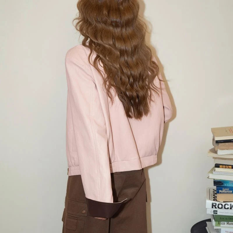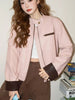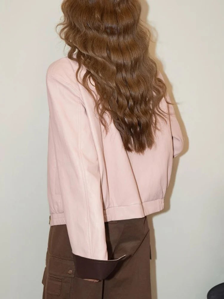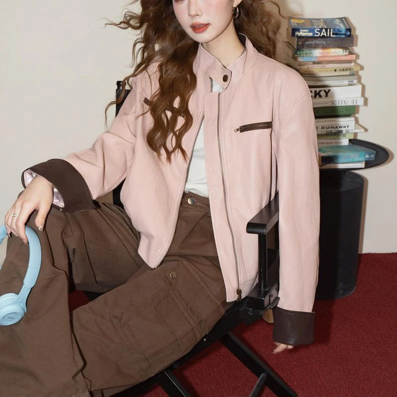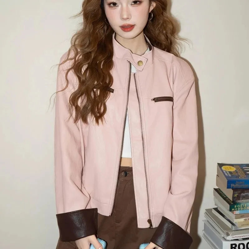 Lunivop Pink Vintage Biker Pu Jacket Women Long Sleeve American Casual Y2K Coat Fall Winter Moto Female O Neck Streetwear Retro Top