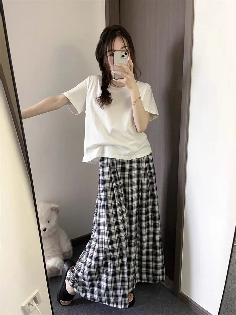 Lunivop Plaid Long Skirt Women Vintage Ruffle Kawaii Midi Skirt Preppy Style Korean Fashion Loose Casual A-line Retro Skirts
