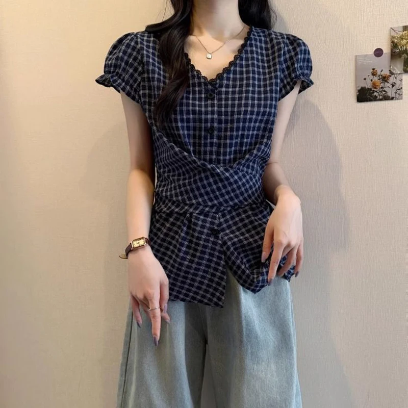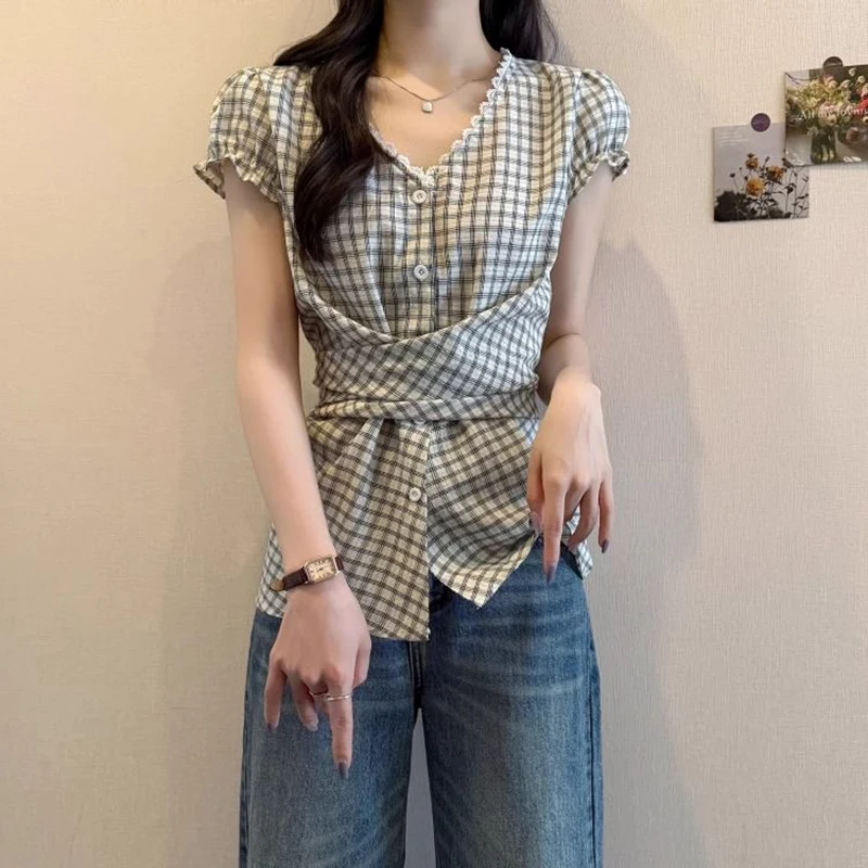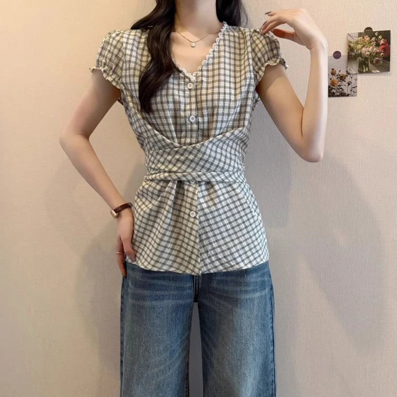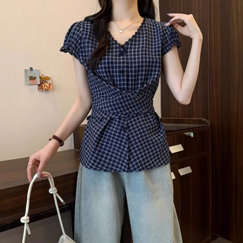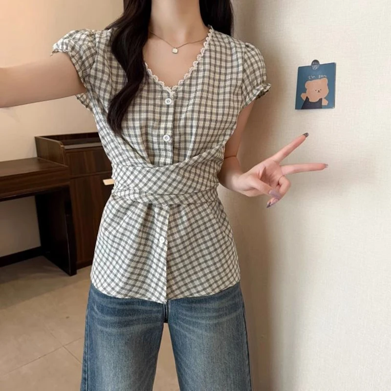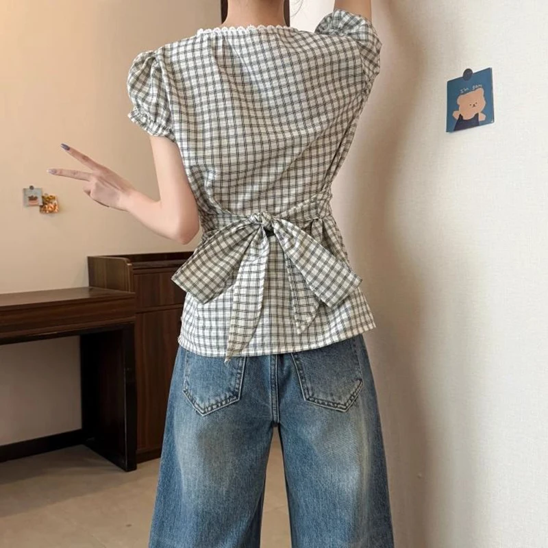 Lunivop Plaid Vintage Blouse Women V Neck Slim Design Back Bandage Shirt Korean Retro Lace Patchwork Casual Summer Bow Sweet Tops