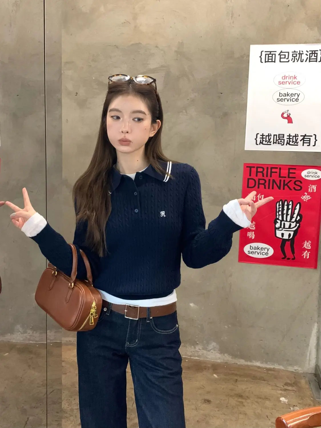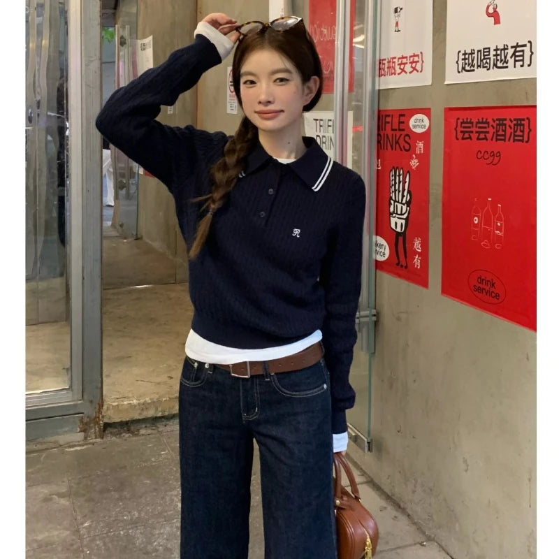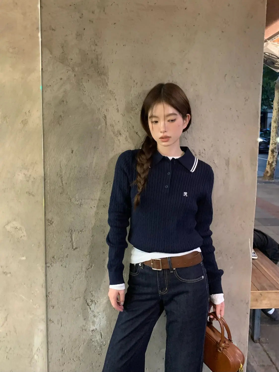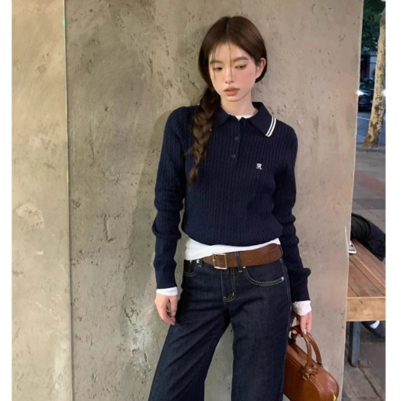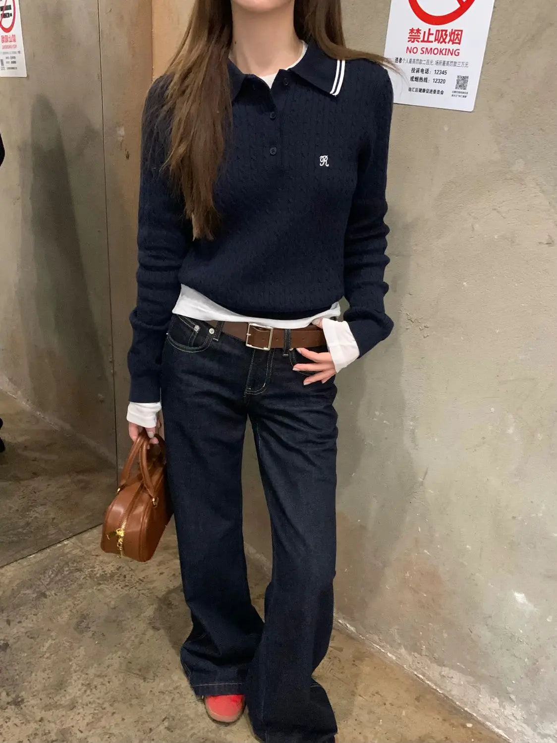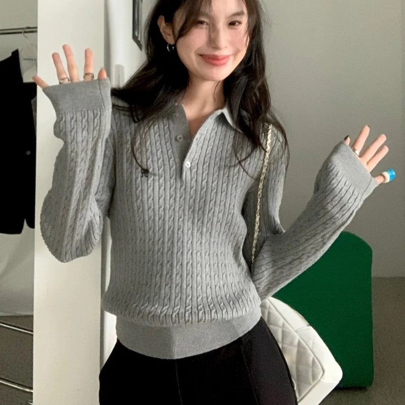 Lunivop Preppy Style Embroidery Sweaters Women Old Money Style Korean Knitted Pullover Vintage Long Sleeve Gray Polo Jumpers