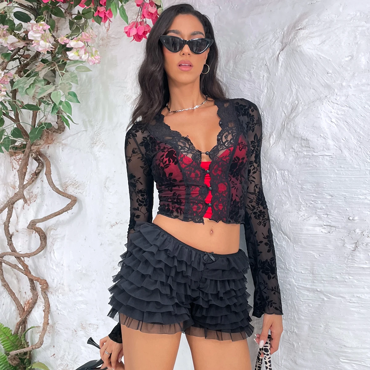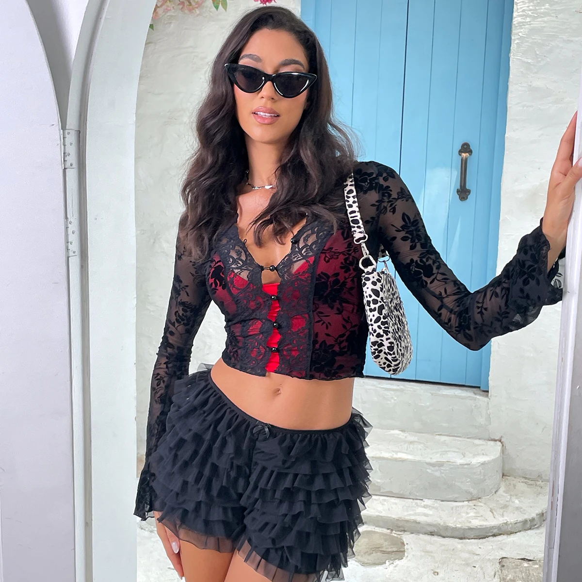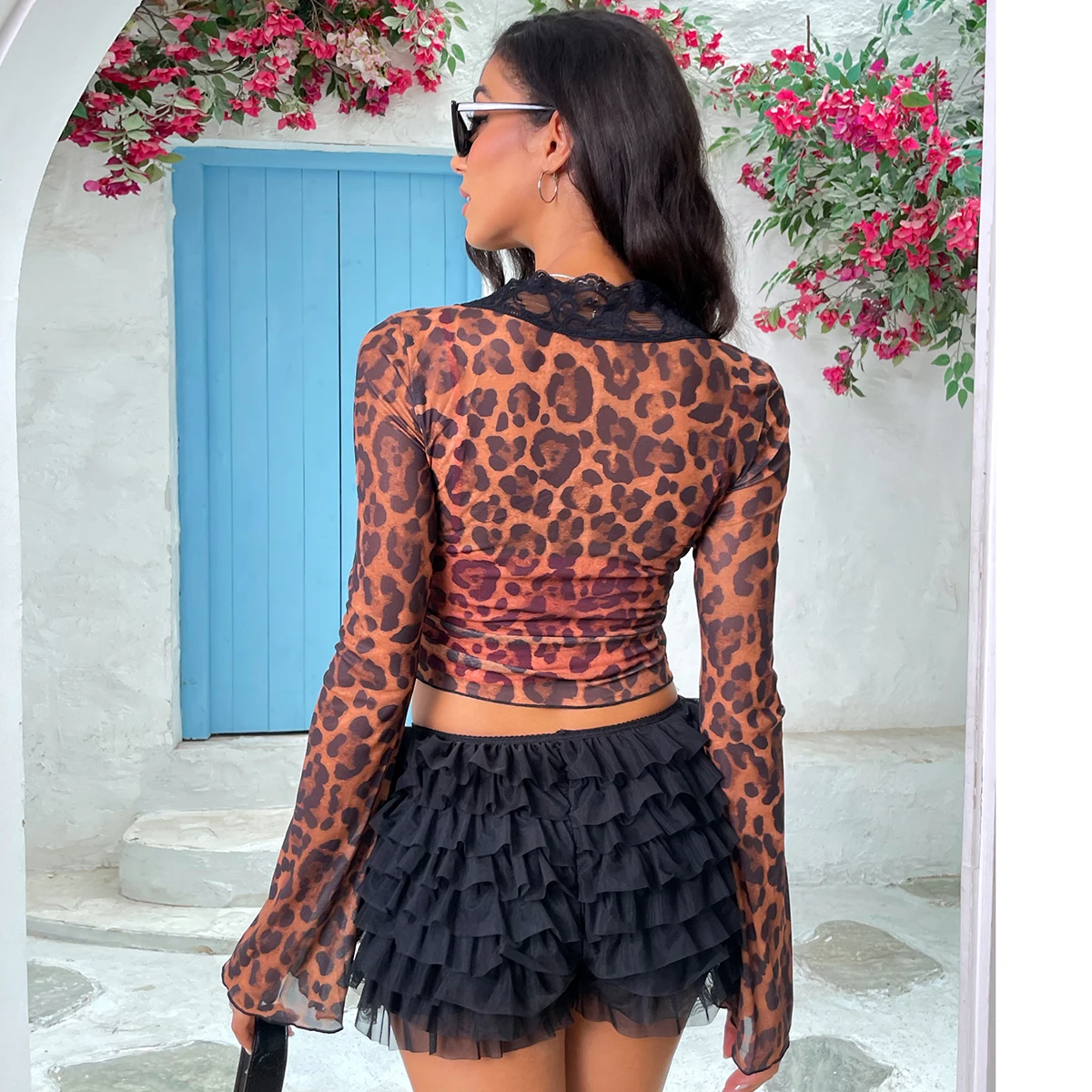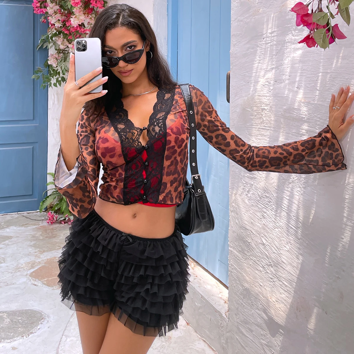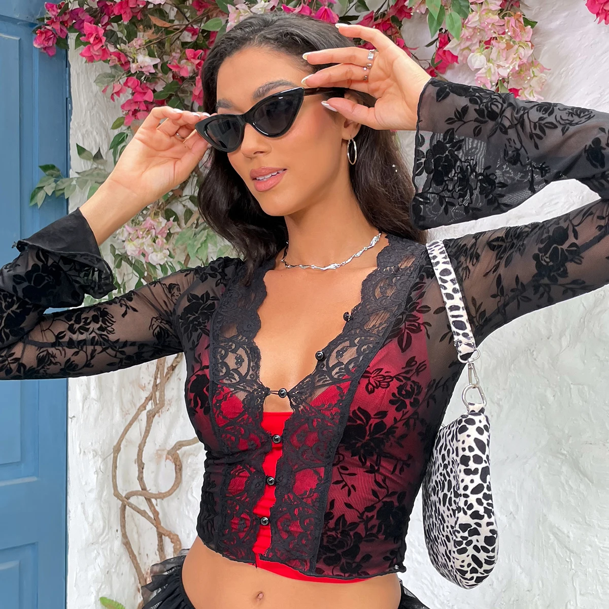 Lunivop Print Button V Neck Sexy Flare Long Sleeve See Through Women'S T-Shirt Tops Summer Blouse 2024 Y2K Casual Clothes