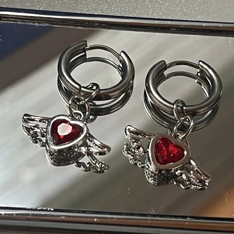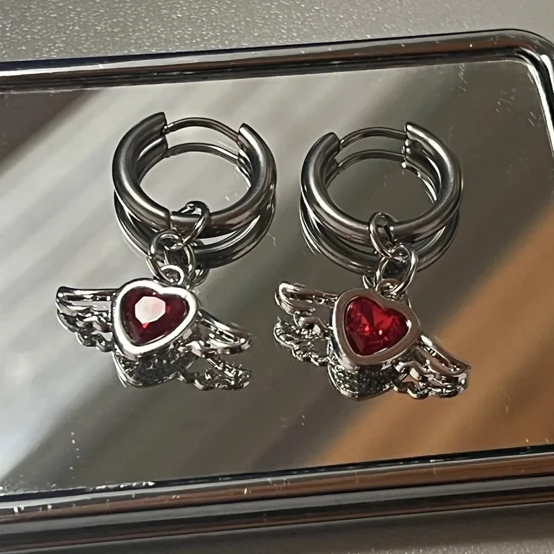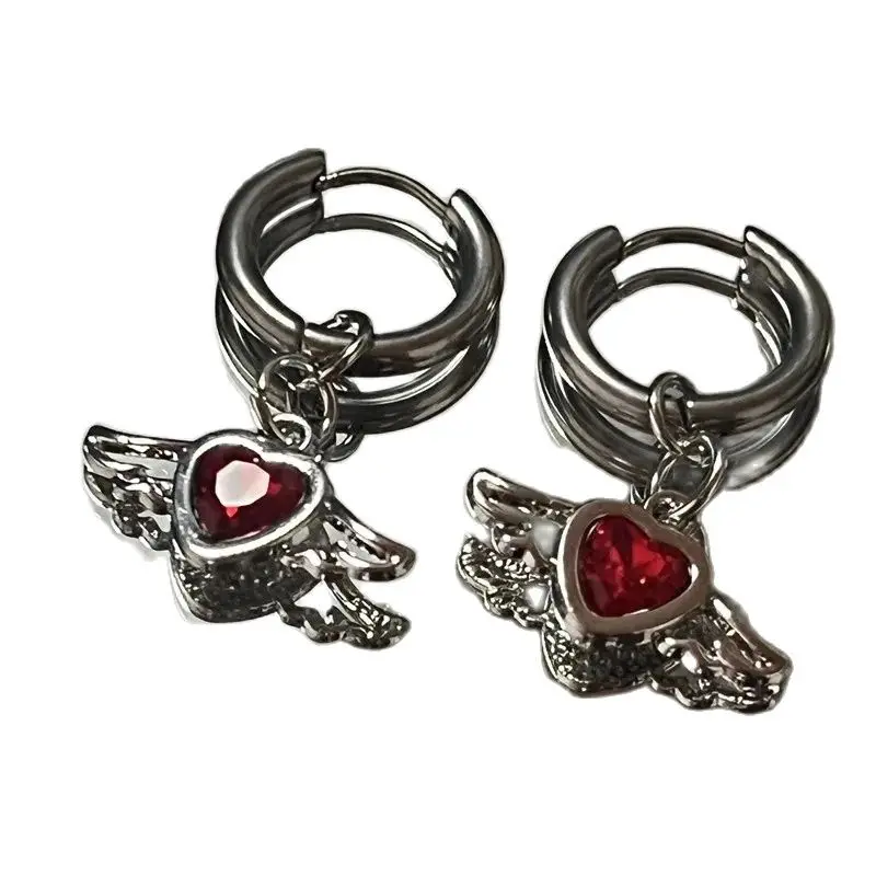 Lunivop Punk Goth Red Zircon Heart Angel Wings Hoop Earrings For Women Men Hot Girls Fashion Vintage 90s Grunge Jewelry Y2K Accessories