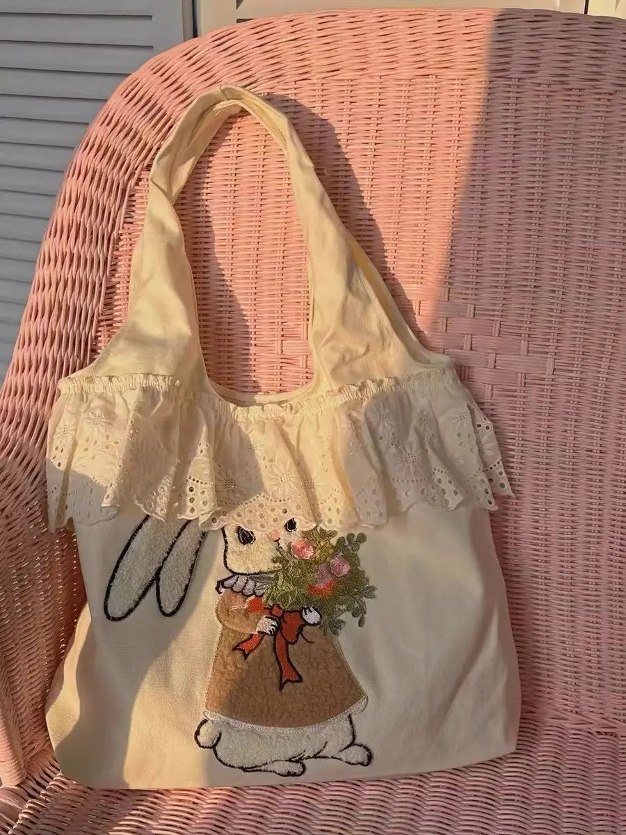 Lunivop Rabbit Embroidery Beige Shoulder Bags Women Lolita Cute Lace Large Capacity Tote Bag Handbag Female Canvas Underarm Bag
