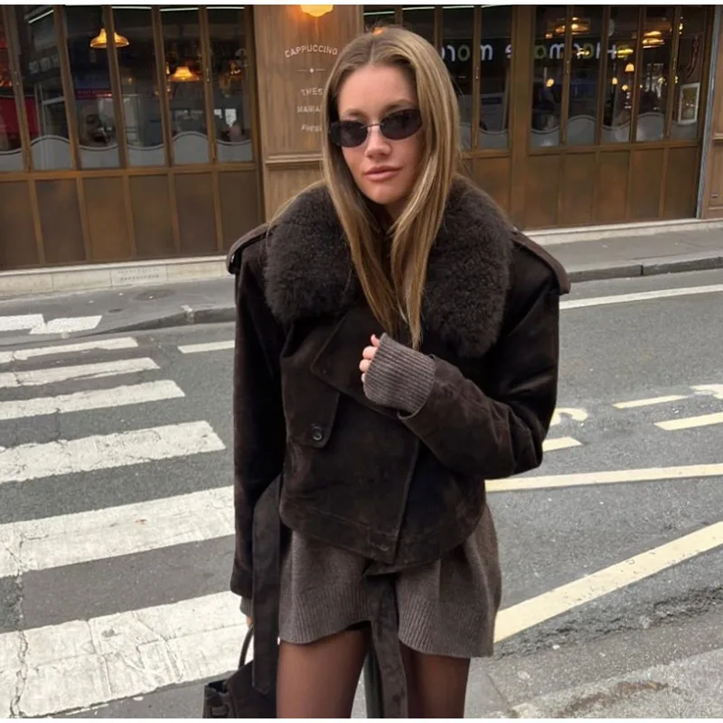 Lunivop Retro Faux Fur Collar Suede Short Coats Women Elegant Lapel Lace Up Long Sleeved Jackets Lady Autumn Solid High Street Outwear