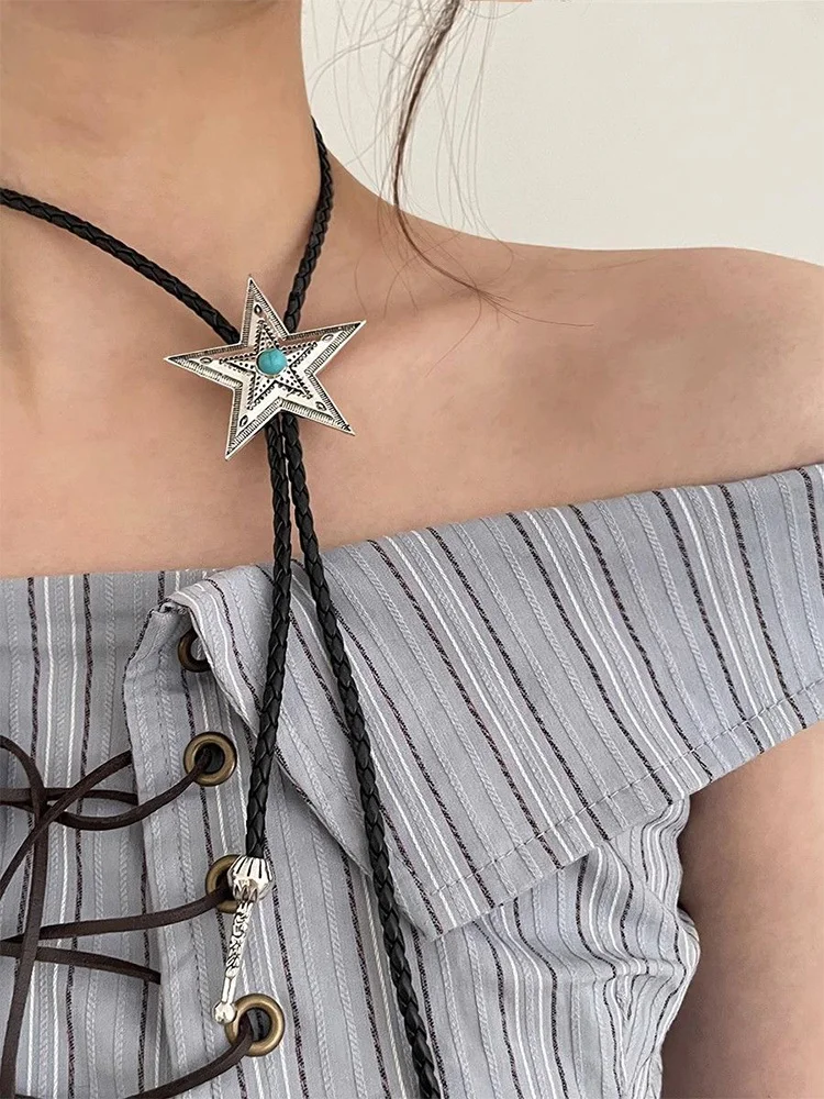 Lunivop Retro Leather Rope Punk Star Pendant Long Necklace Female Niche Design Personality Adjustable Drawstring Accessories JewelryTide