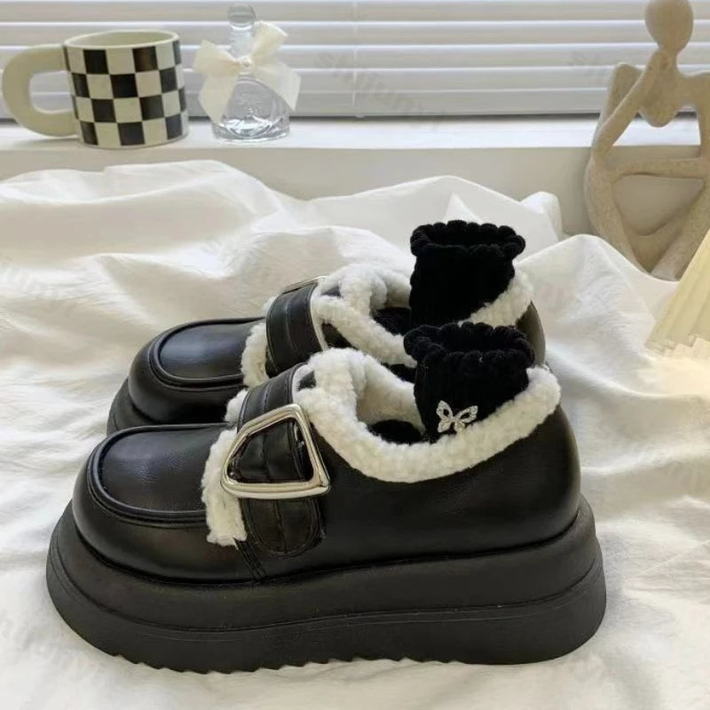 Lunivop Retro Leather Velvet Winter Women's Loafers Fashion Platform Mary Jane Shoes for Women Designer Casual Ladies Warm Cotton Shoes