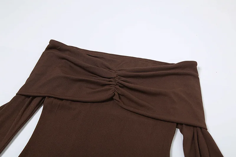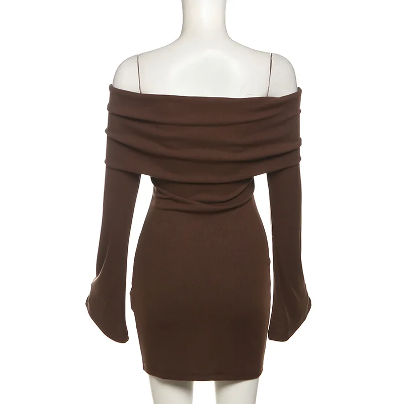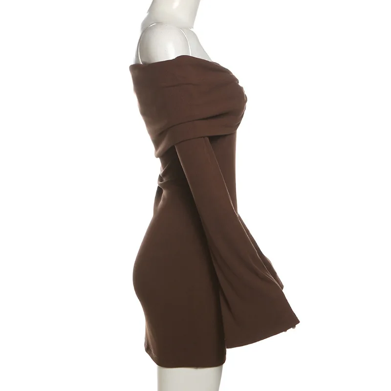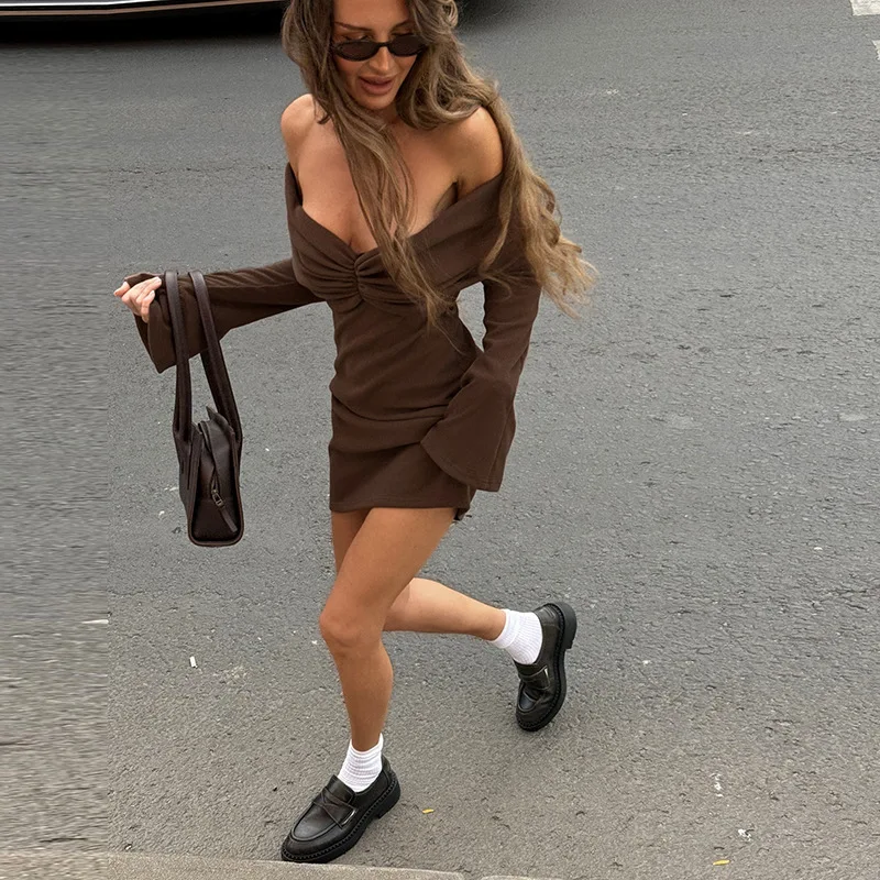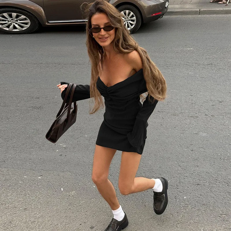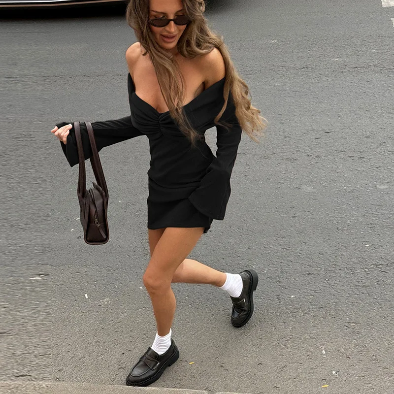 Lunivop Retro One-Shoulder Slim Flare Sleeve Dress Women's Solid Ruched Mini Sexy Dress High Waist Hot Girl Club Party Clothes